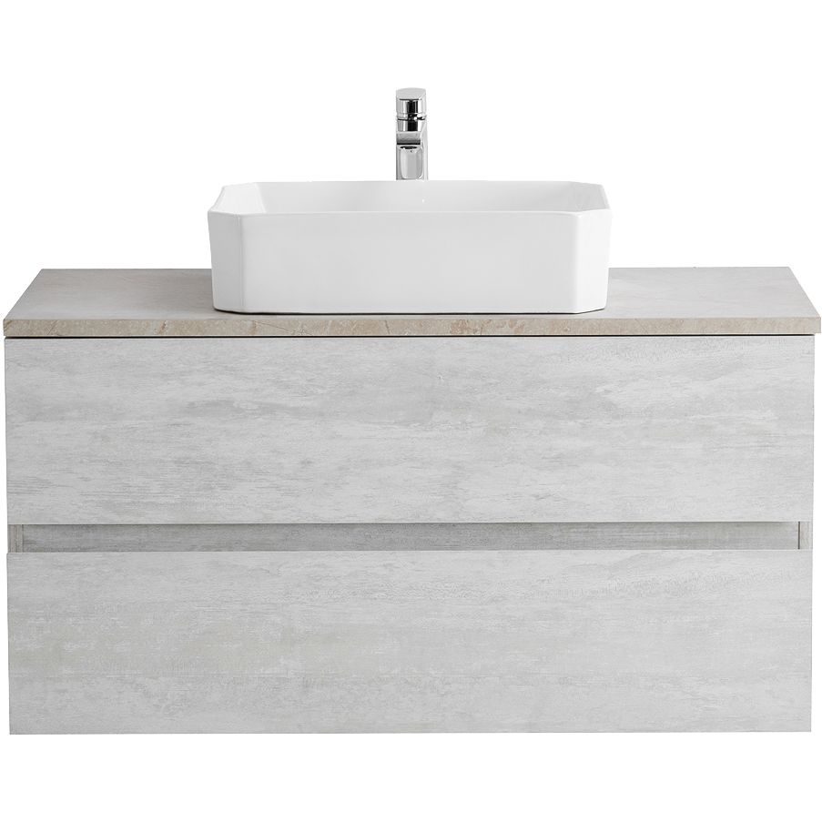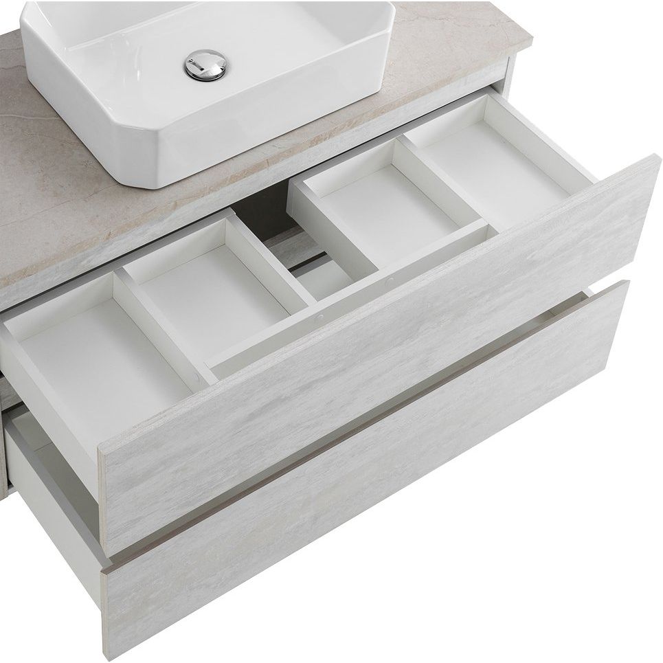 Эта подвесная тумба из коллекции Cezares Molveno имеет габариты 99,7x46x50 см, что делает её компактной и удобной для небольших помещений. Корпус и фасады выполнены из ЛДСП и покрыты качественным ламинатом, обеспечивающим долговечность и устойчивость к влаге. В комплект также входит стильная накладная раковина BelBagno BB1386 из фаянса с габаритами 49x38 см. Раковина рассчитана под сифон диаметром 3.2 см, однако донный клапан нужно будет приобрести отдельно. В качестве столешницы используется керамогранит BelBagno KEP-100-MCO в бежевом цвете, с одним готовым отверстием под смеситель, что упрощает установку.