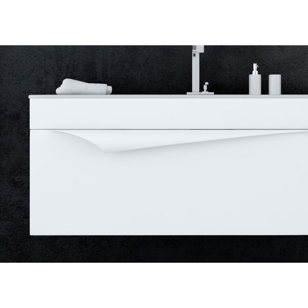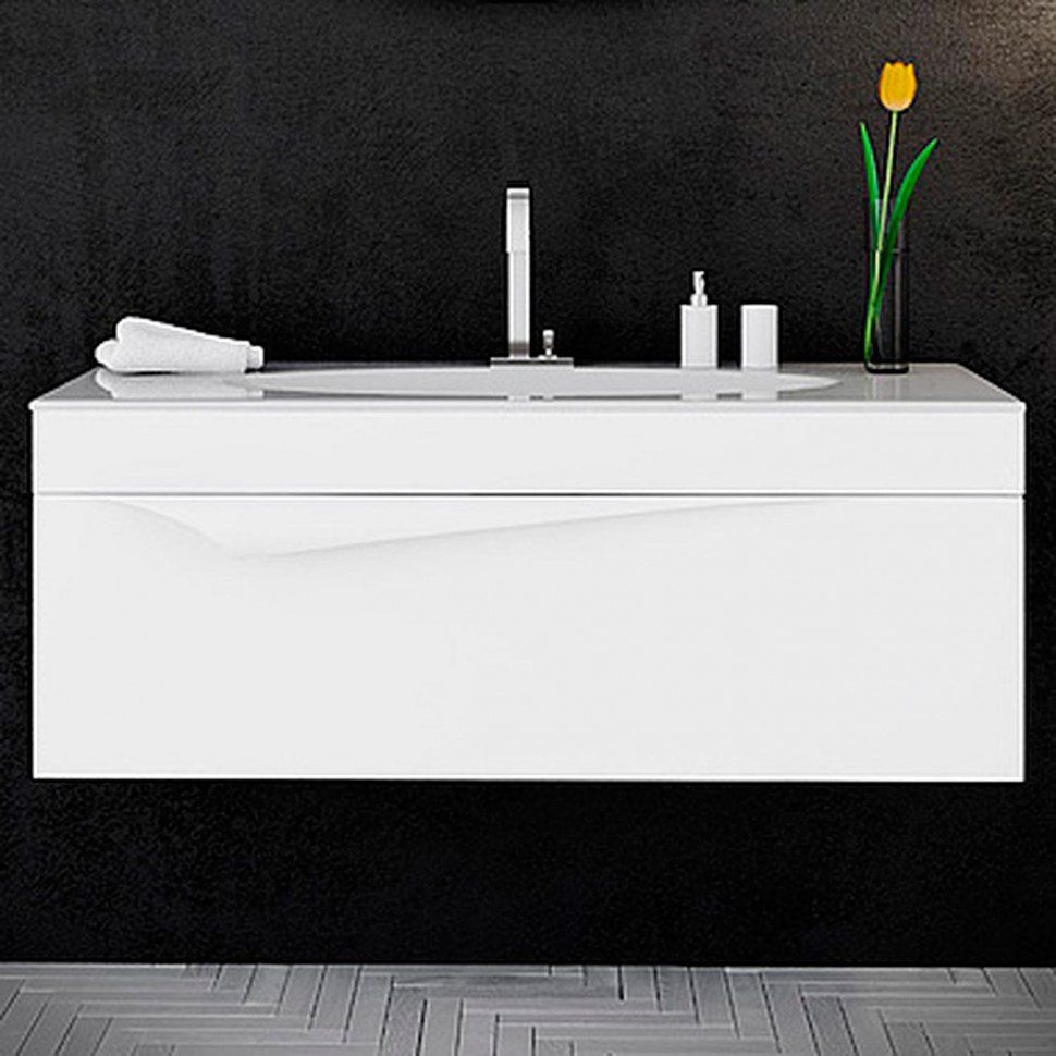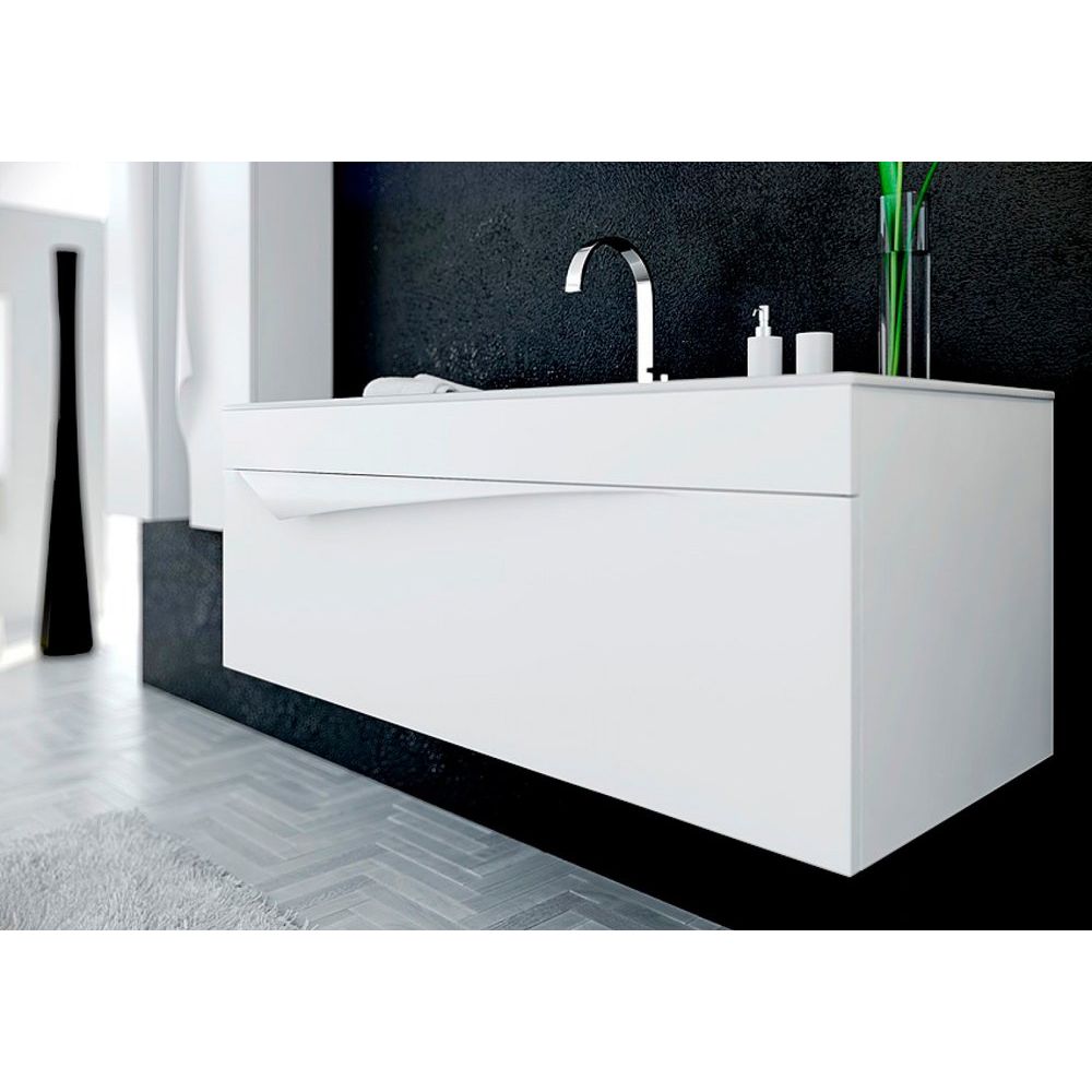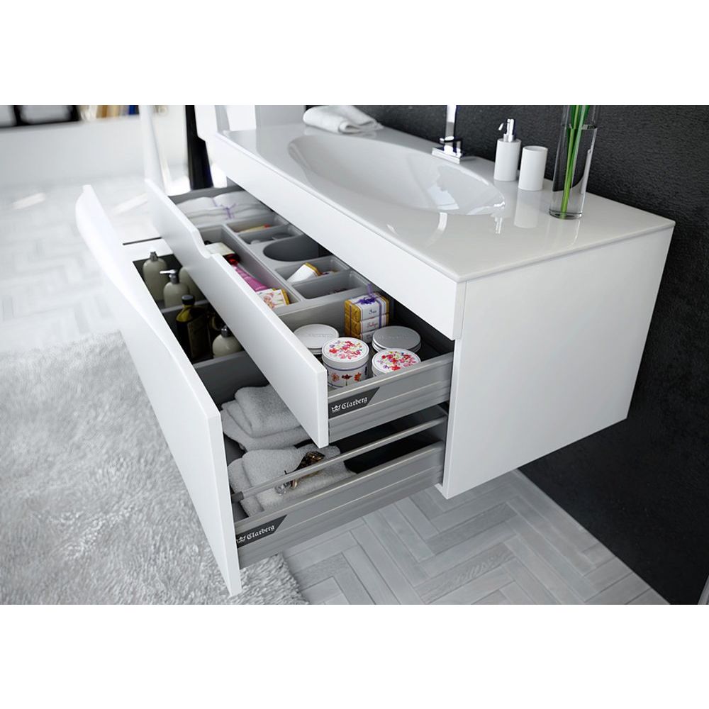 Этот комплект мебели для ванной комнаты состоит из тумбы и раковины. Размеры тумбы — 120x50x46 см, она подвесная с системой доводчика для плавного закрывания. Корпус сделан из прочного МДФ с эмалевым покрытием. Основной ящик с системой «Push to Open» оснащен тремя отсеками, а внутренний ящик — пластиковым сегрегатором для мелочей.
