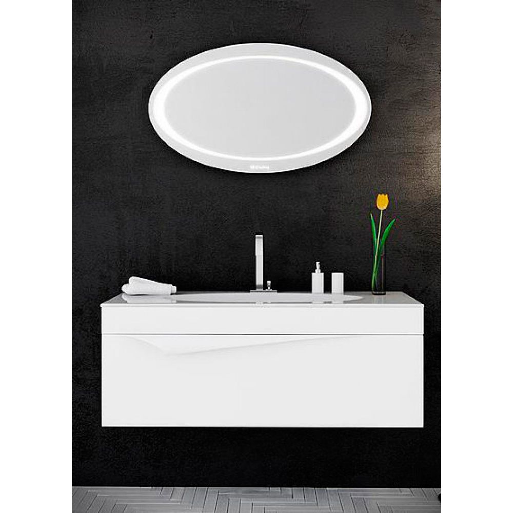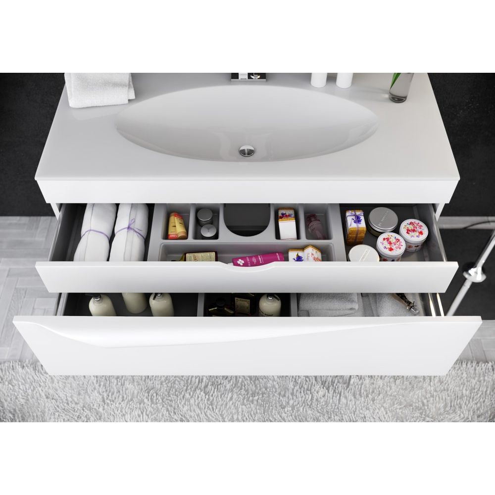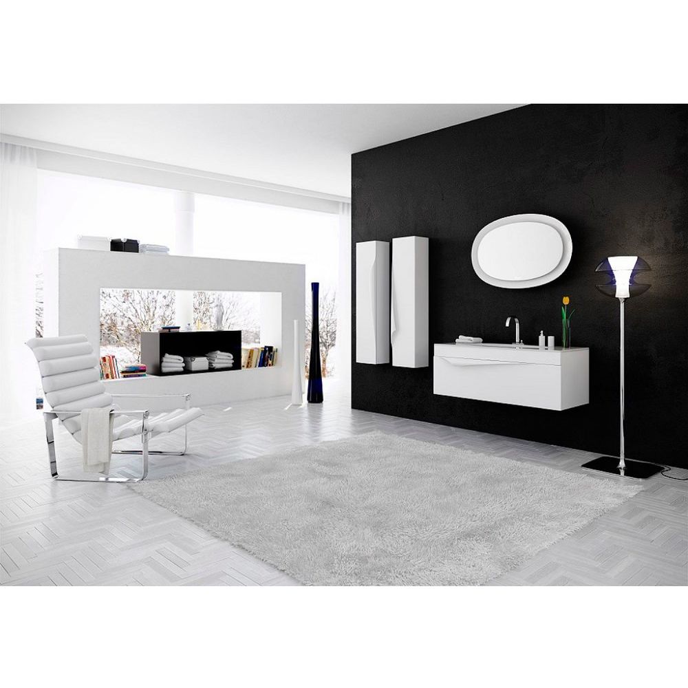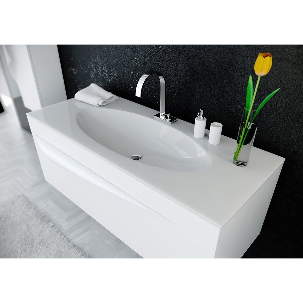 Этот комплект мебели для ванной комнаты состоит из тумбы и раковины. Размеры тумбы — 120x50x46 см, она подвесная с системой доводчика для плавного закрывания. Корпус сделан из прочного МДФ с эмалевым покрытием. Основной ящик с системой «Push to Open» оснащен тремя отсеками, а внутренний ящик — пластиковым сегрегатором для мелочей.