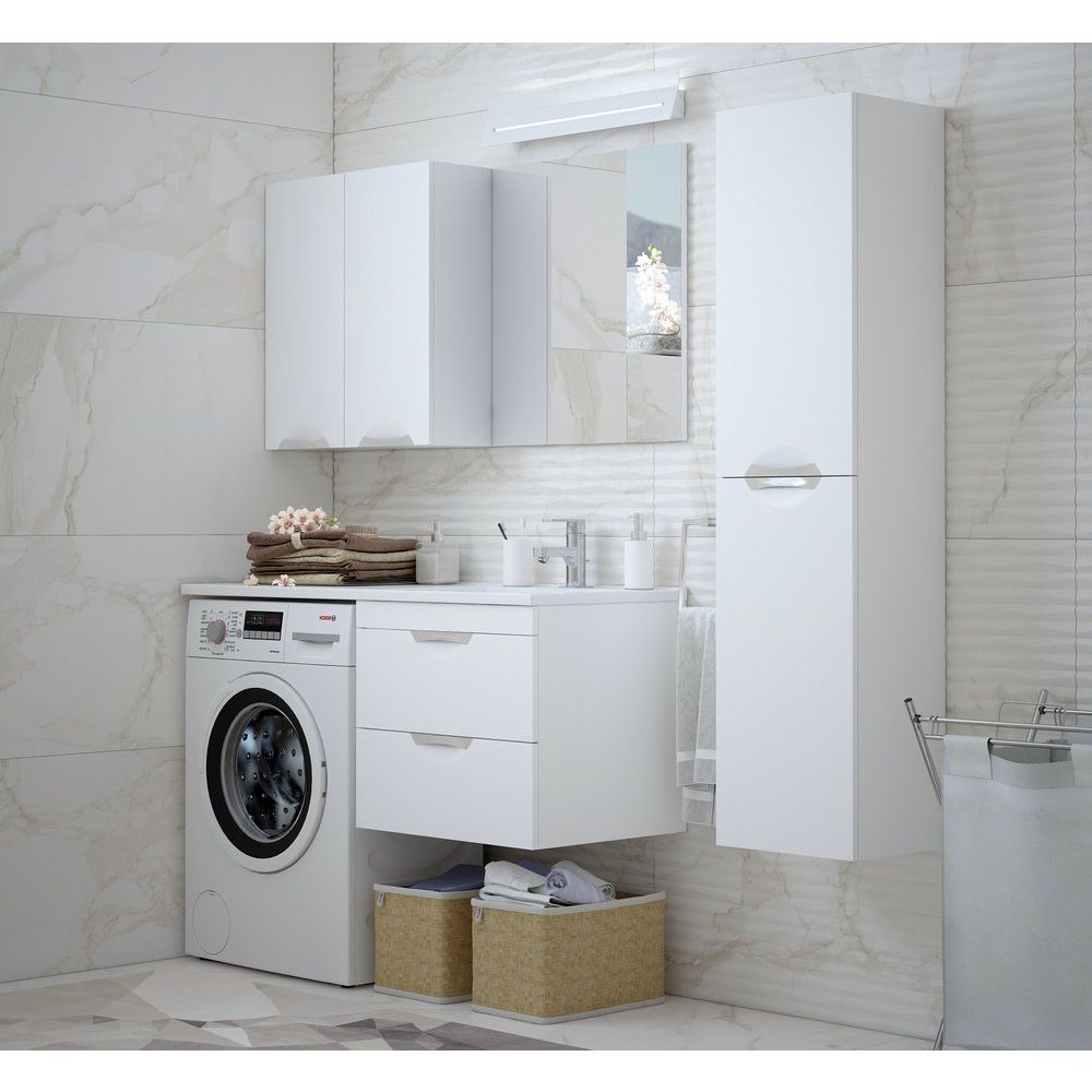 Основной элемент комплекта — подвесная тумба с габаритами 56x47,5x48,5 см, выполненная из прочных и влагостойких материалов. Тумба оснащена механизмом доводчика для плавного закрывания и рассчитана под установку стиральной машины. Цвет хромированной фурнитуры подчеркивает современный стиль.