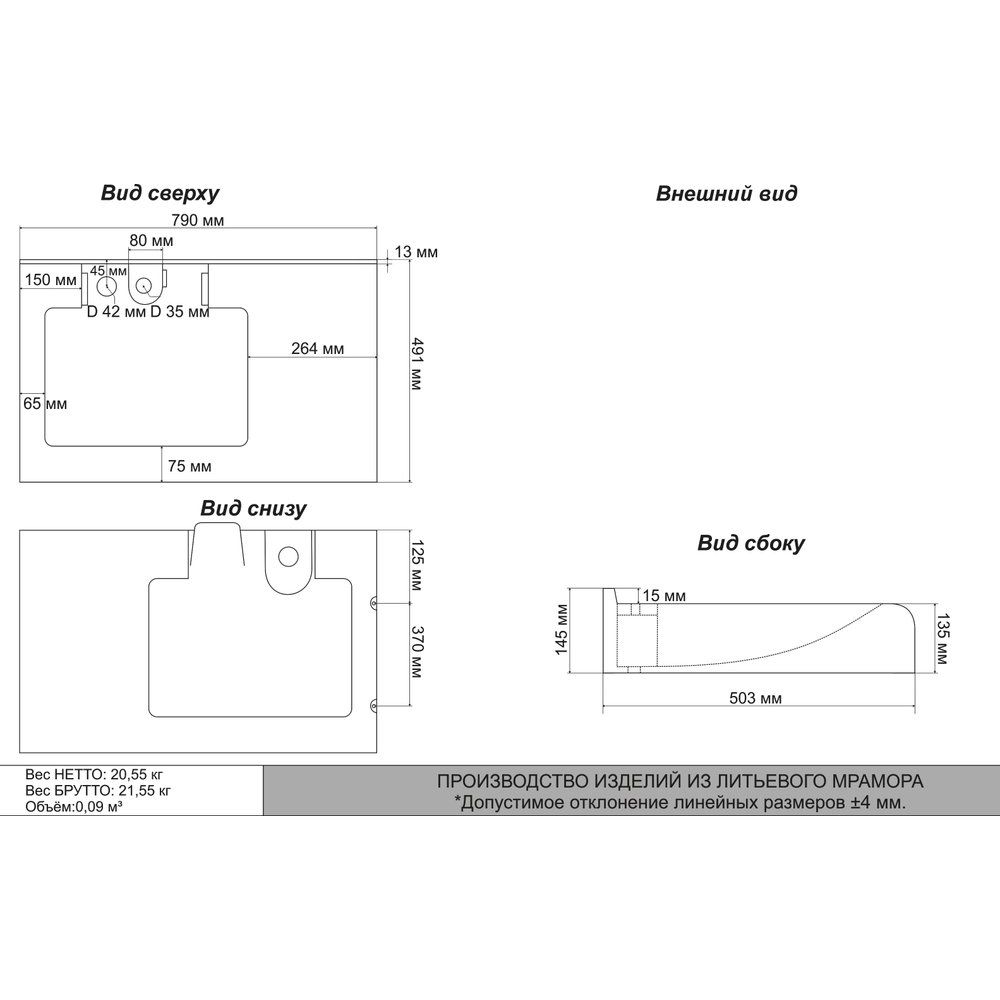 Раковина Stella Polar Корини из искусственного мрамора размером 79x49,1 см подходит для установки над стиральной машиной. Она оснащена одним отверстием под смеситель и специальными кронштейнами для крепления, рассчитана на сифон диаметром 3,2 см и имеет гарантию 4 года.