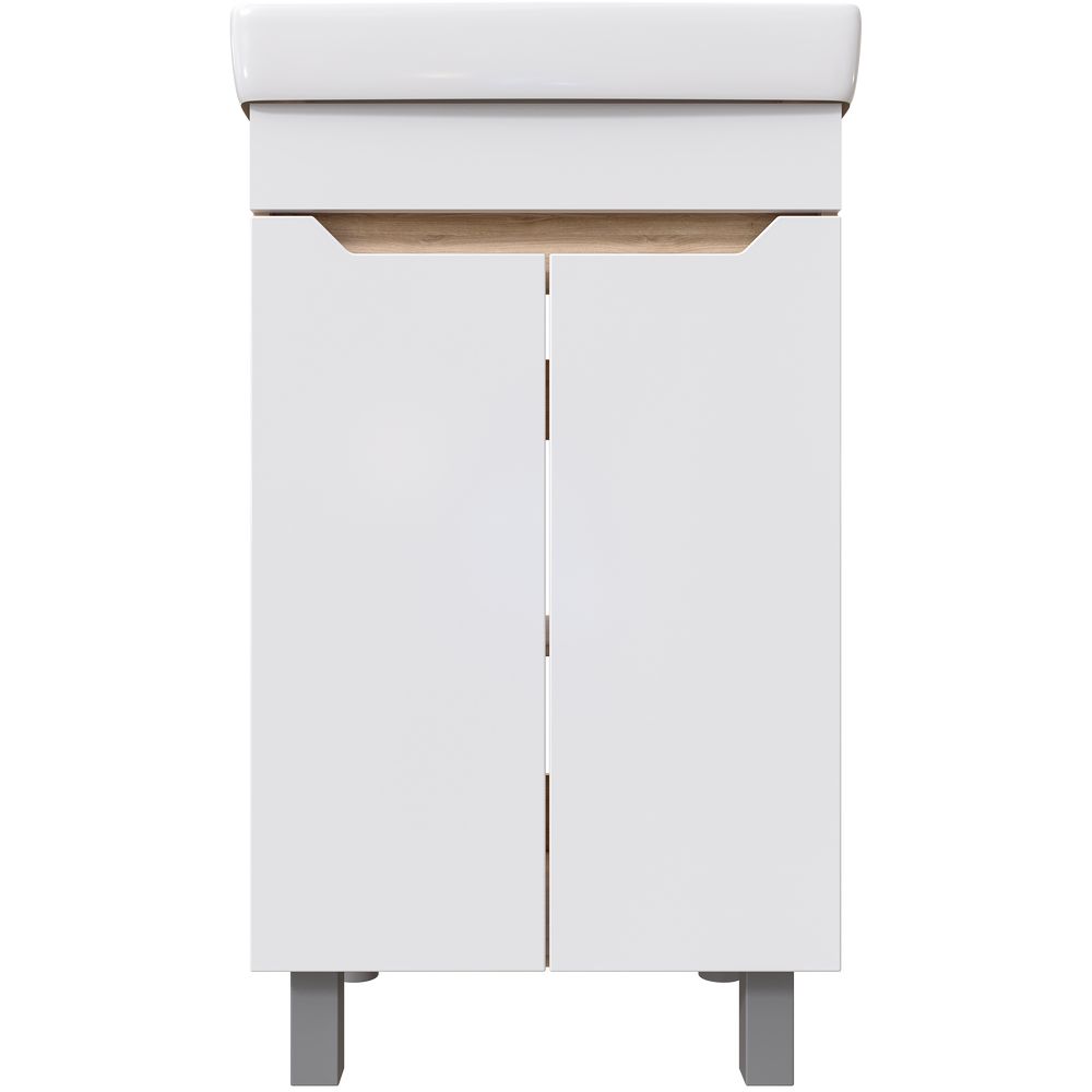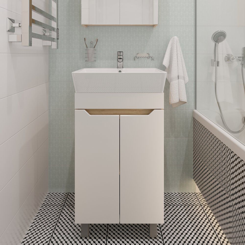 Тумба: Габариты: 47x38.4x79 см. Напольная конструкция с доводчиком для плавного закрывания дверок. Корпус выполнен из ЛДСП, фасад — из МДФ, оба покрыты плёнкой для защиты. Внутри тумбы предусмотрены несъёмные полки для удобного хранения. Изделие произведено в России и имеет гарантию один год.