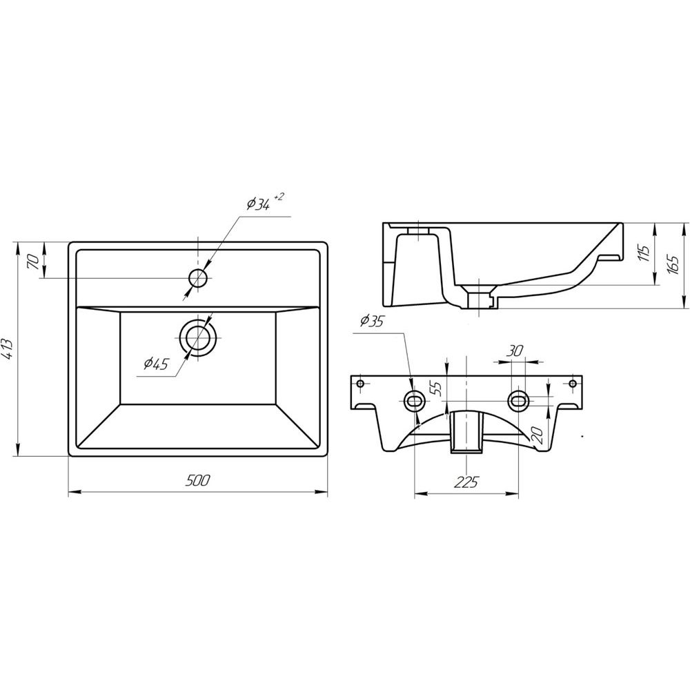 Раковина: Габариты: 50x41.3 см. Подвесная, изготовлена из высококачественного фаянса. Комплектация включает слив-перелив и простое подключение к канализационной системе (диаметр 3.2 см), однако донный клапан приобретается отдельно. Обладает пятилетней гарантией.