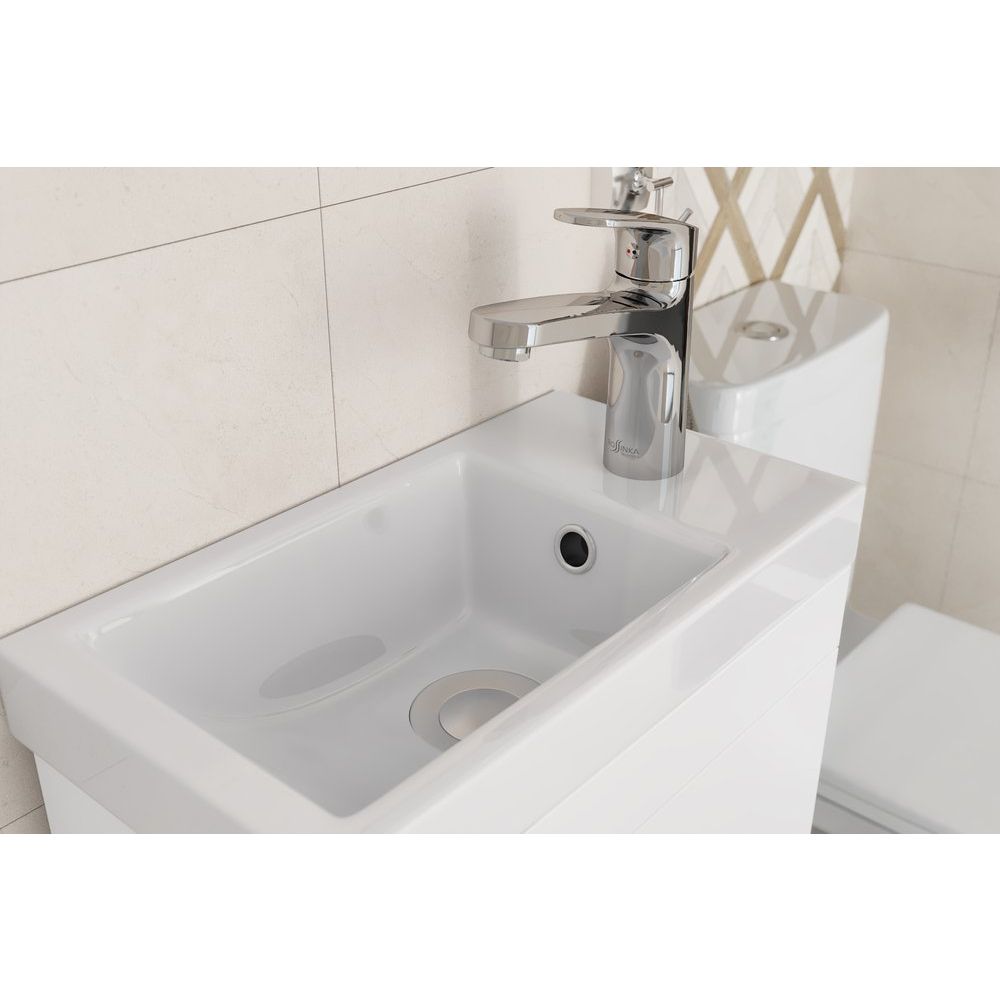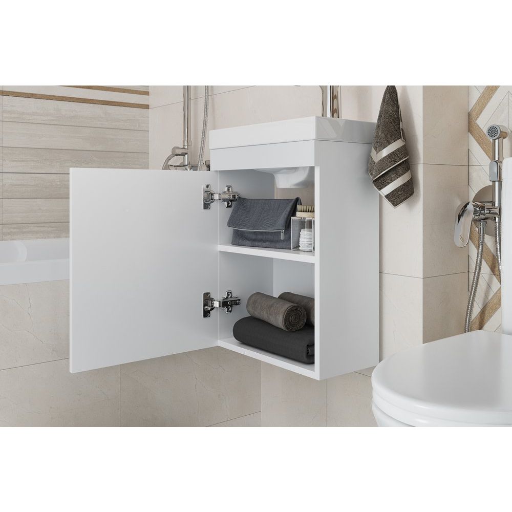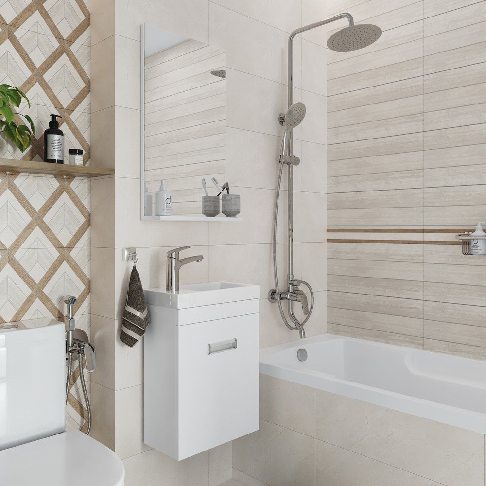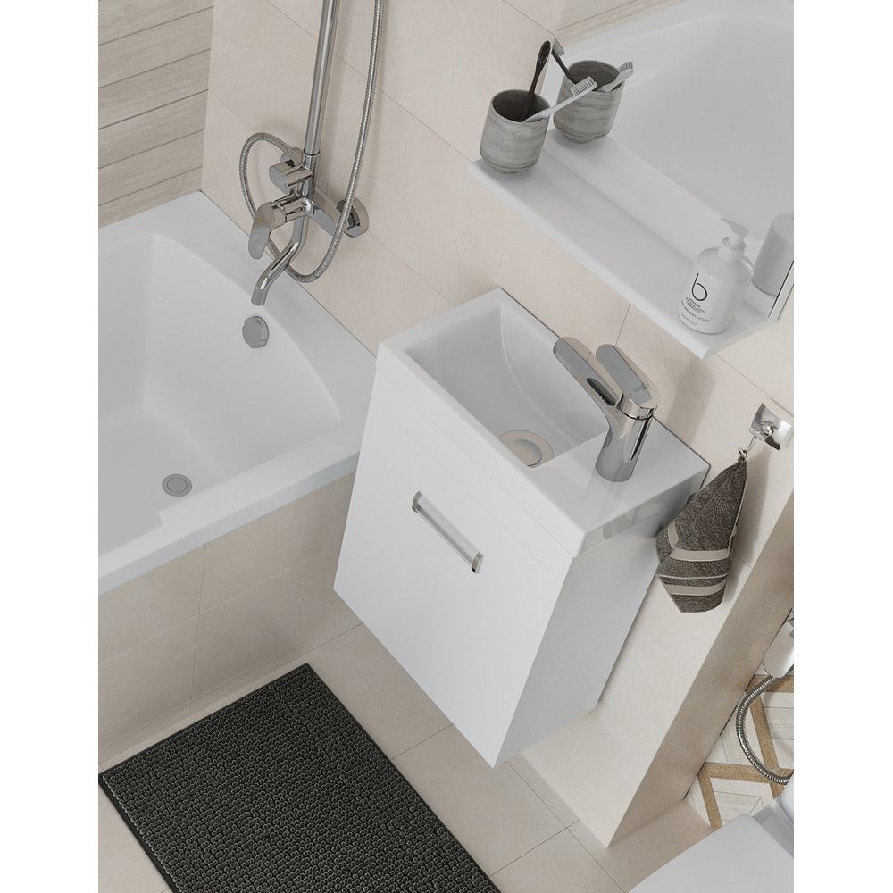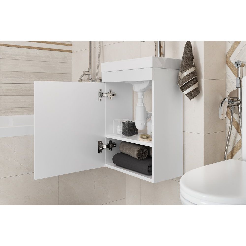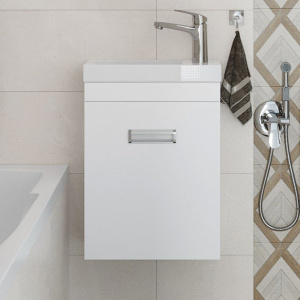 Идеальное решение для совмещенных санузлов — подвесная тумба с раковиной DIWO «Псков 40». Ее компактные размеры, всего 40 см шириной, облегчают установку в ограниченном пространстве между ванной и унитазом. Современный дизайн дополняет функциональность: два закрытых отсека обеспечивают удобное хранение. Плоская ручка минимизирует риск случайных травм, делая использование безопасным и комфортным.