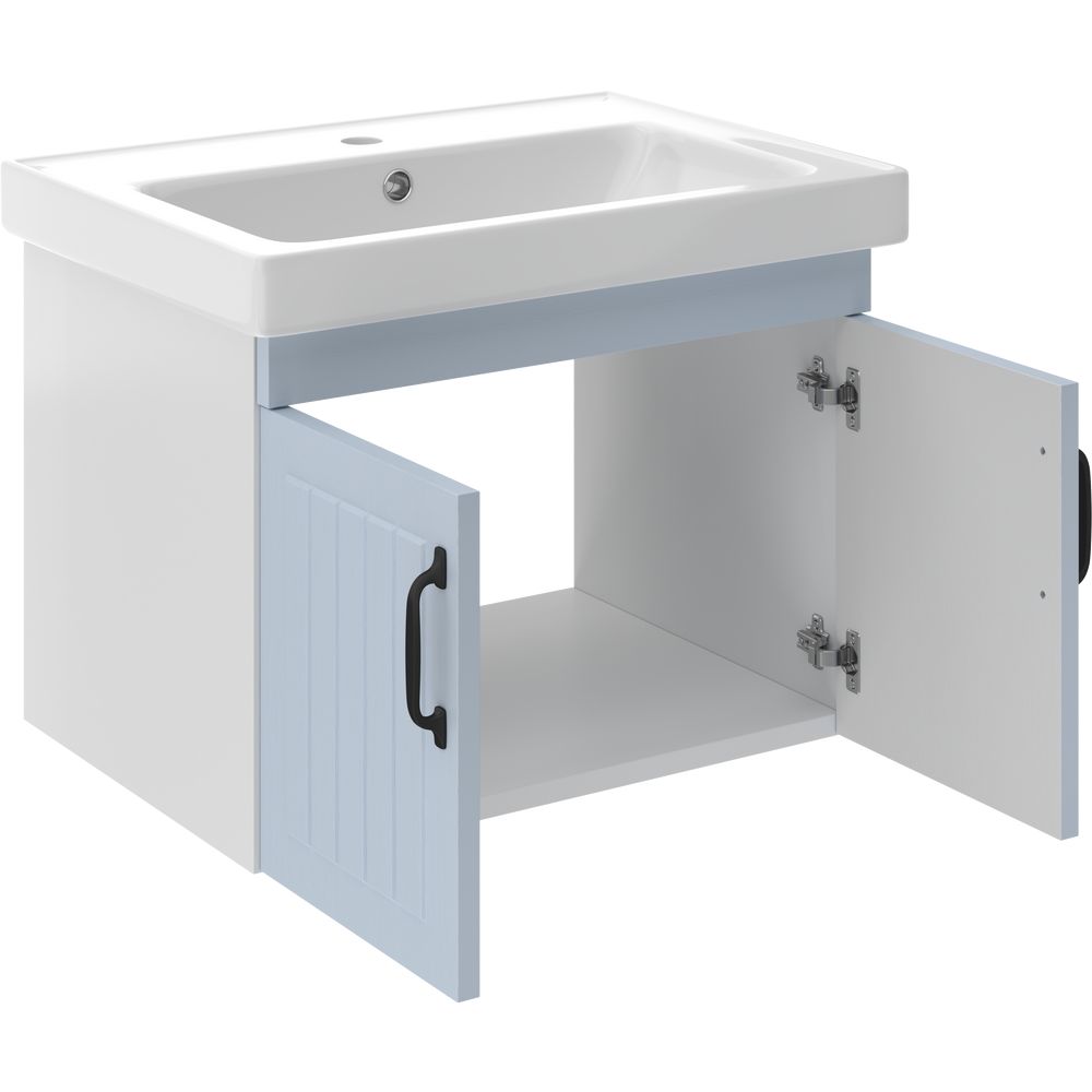 Тумба для комплекта DIWO Сочи 60 выполнена в цвете дуб альбион с подвесной конструкцией размером 55,6х41,4х40 см. Изготовлена из ДСП и МДФ, покрытых пленкой, с черной фурнитурой. Механизм доводчика обеспечивает плавное и бесшумное закрытие дверок. Имеет несъемные полки, что обеспечивает стабильность конструкции. Гарантия составляет 2 года.
