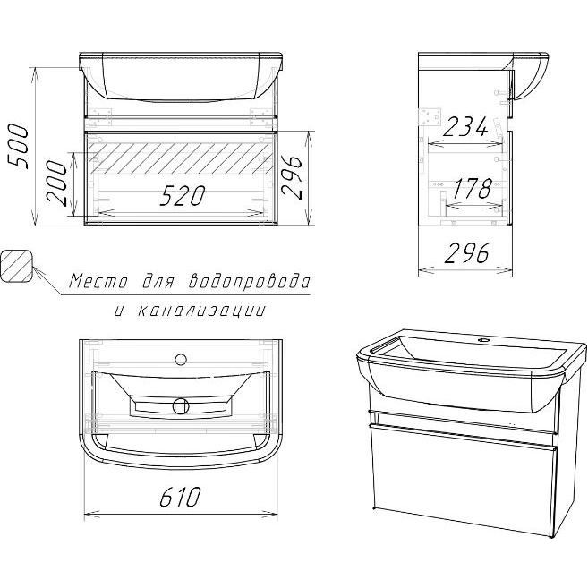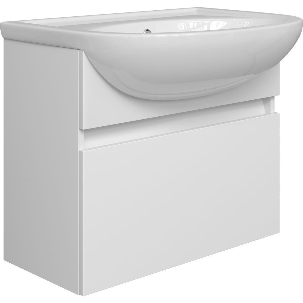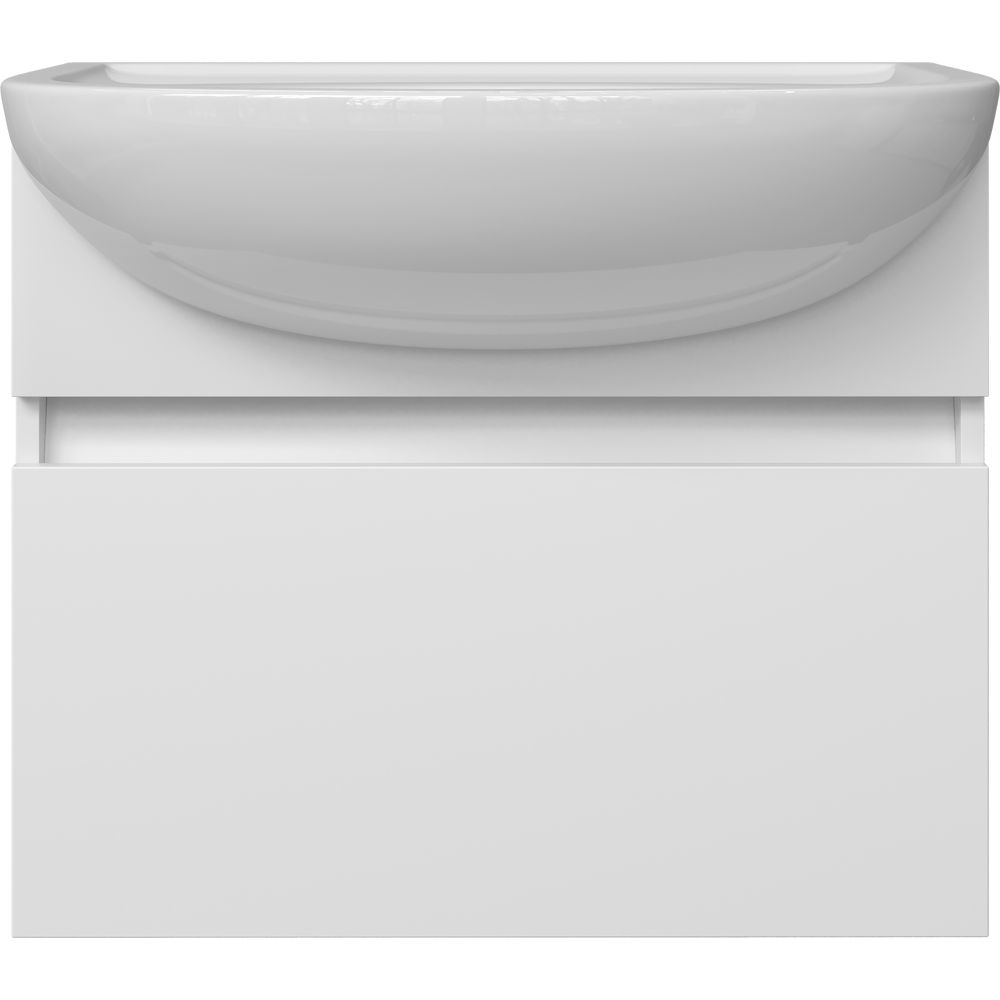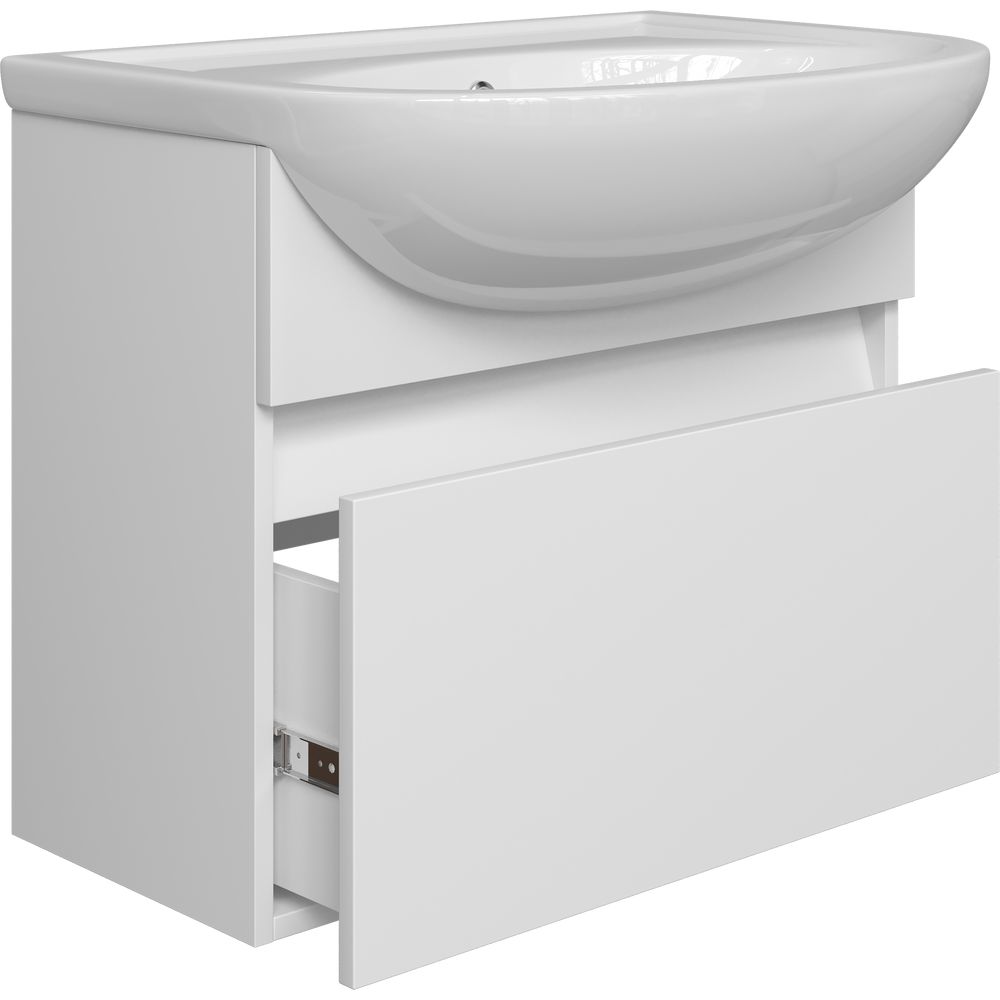 Тумба под раковину выполнена в подвесной конструкции с размерами 59,2x30,3x50 см. Её корпус изготовлен из надёжного ЛДСП, покрытого прочным ламинатом, а фасад из красивого МДФ с защитной пленкой. Механизм доводчика обеспечивает мягкое закрывание ящиков.