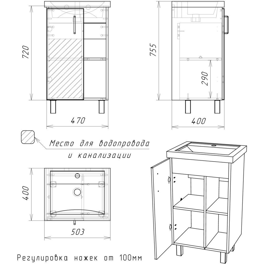 Габариты тумбы — 47x40x82 см, что обеспечивает компактное размещение даже в небольших ванных комнатах. Тумба напольная, оснащена механизмом доводчика для мягкого и бесшумного закрывания двери. Корпус изготовлен из ламината ЛДСП, а фасад — из МДФ с пленочным покрытием, что гарантирует долговечность и устойчивость к влажности. Изящная черная фурнитура придает изделию стильный акцент. Внутренние полки надежно закреплены и не снимаются, предоставляя достаточно места для хранения. Гарантия на тумбу составляет 2 года.