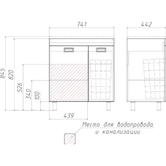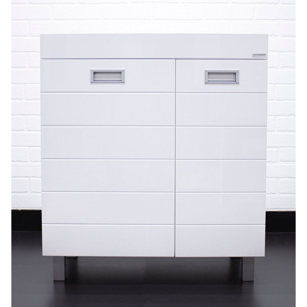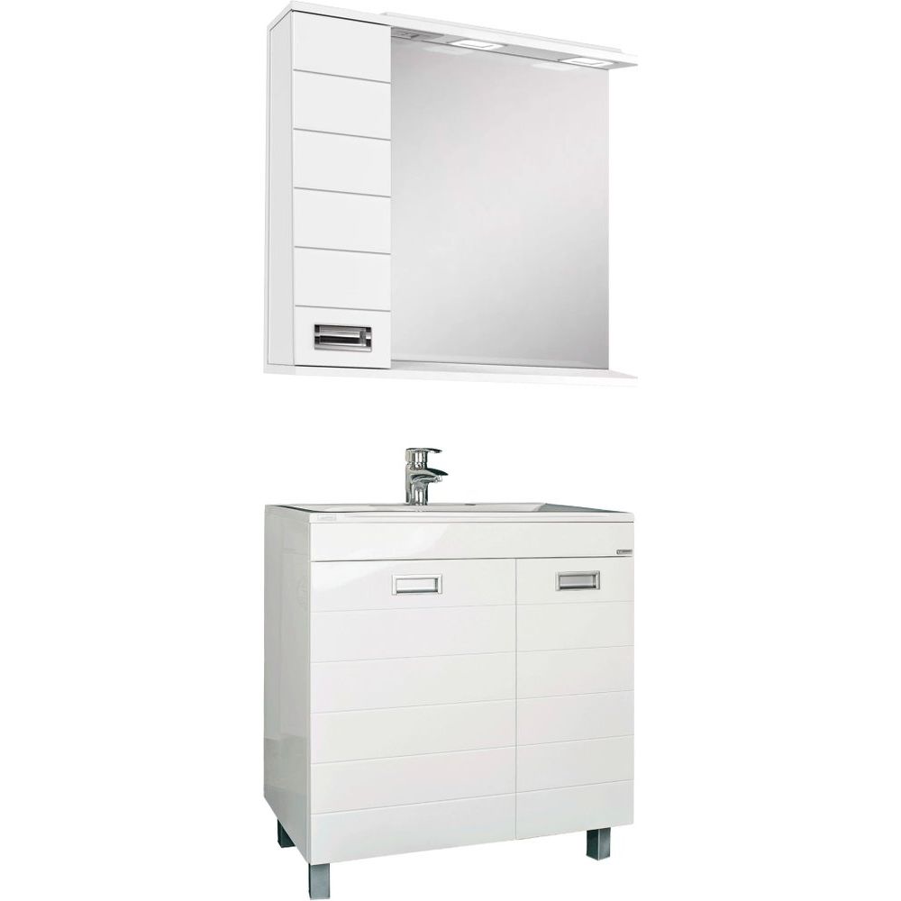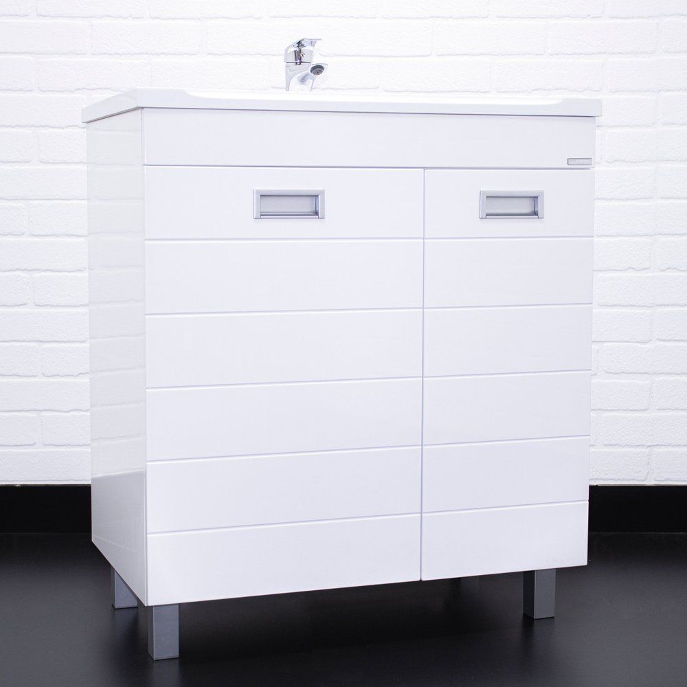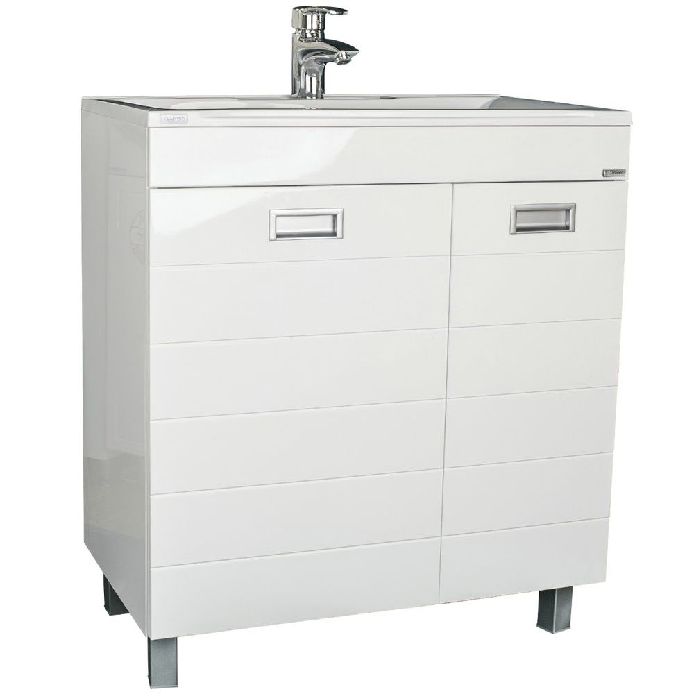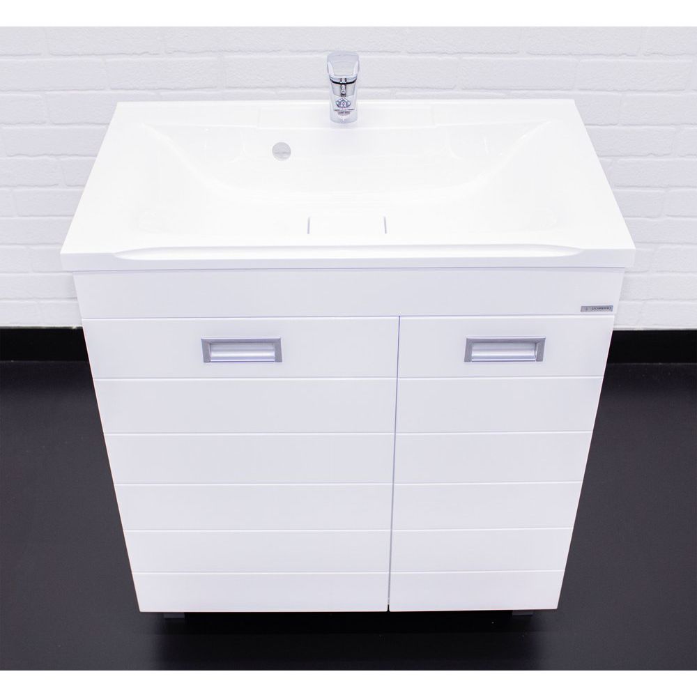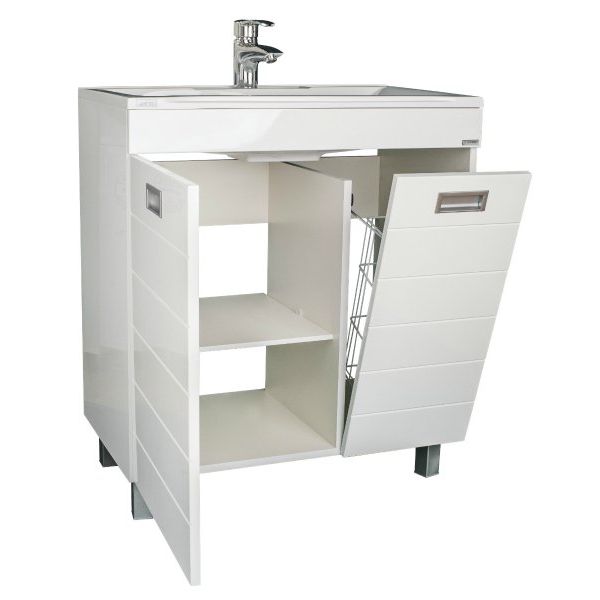 Тумба Домино Cube 75 обладает габаритами 74,1x44,2x82 см и устанавливается на пол благодаря устойчивым опорным ножкам. Корпус выполнен из ламинированного ЛДСП, а фронтальная часть из эмалированного МДФ с хромированной фурнитурой. Внутри тумбы предусмотрена бельевая корзина, а полки несъемные, что обеспечивает дополнительную жесткость конструкции. Раковина Madera Milen имеет размеры 74,2x44,5 см и выполнена из искусственного мрамора, оснащена декоративной накладкой на слив и арматурой для слива-перелива, подходит для сифона диаметром 3.2 см и имеет одно готовое отверстие для смесителя.