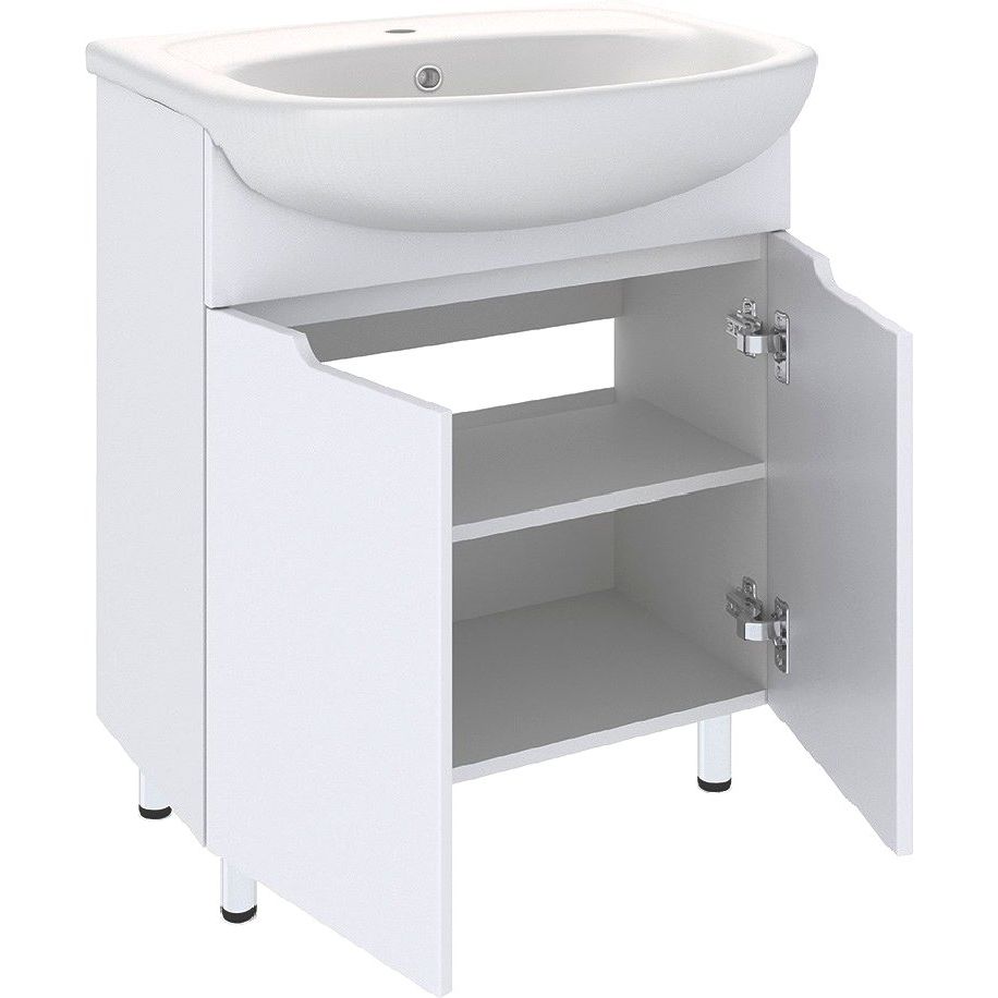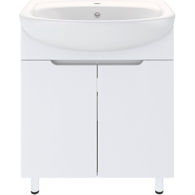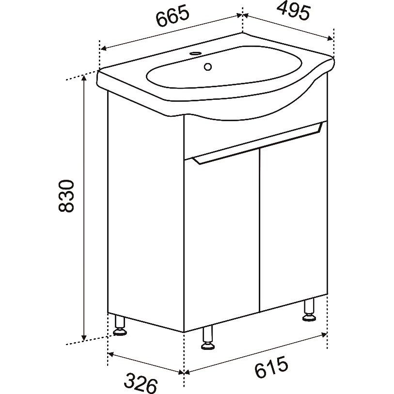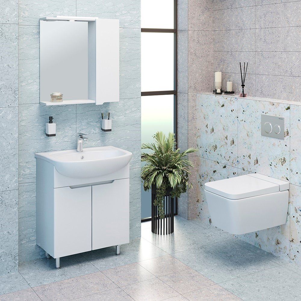 Тумба для комплекта Emmy Агата 65 имеет габариты 61,5×32,6×78 см, что делает её компактной и удобной для напольной установки. Корпус и фасады выполнены из надежного ЛДСП, покрытого пленкой, что обеспечивает дополнительную защиту. Внутри предусмотрены съемные полки для удобного хранения. Раковина Santek Стелла 1WH110174 65 подвесная, изготовлена из прочного фарфора, с встраиваемым сливом-переливом и готовым отверстием под смеситель. Не забудьте приобрести донный клапан отдельно.