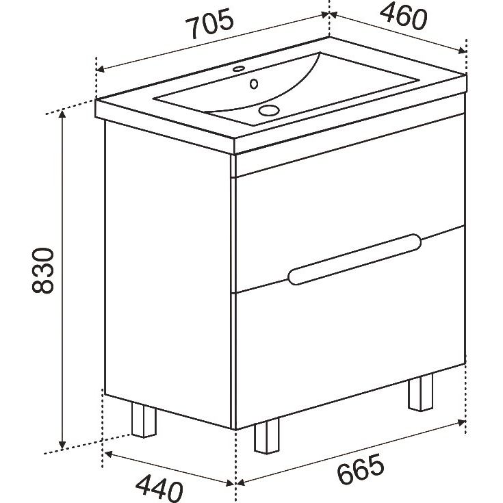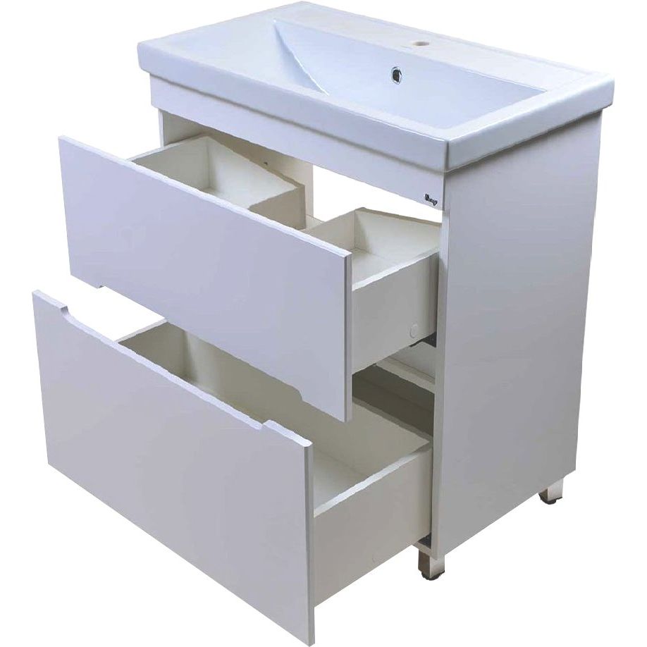 Тумба для комплекта Emmy Вита 70 имеет следующие габариты: 66,5 см в ширину, 44 см в глубину и 78 см в высоту. Тумба — напольная и обладает ящиками для удобного хранения. Вся конструкция сделана из МДФ с пленочным покрытием для защиты от влаги.