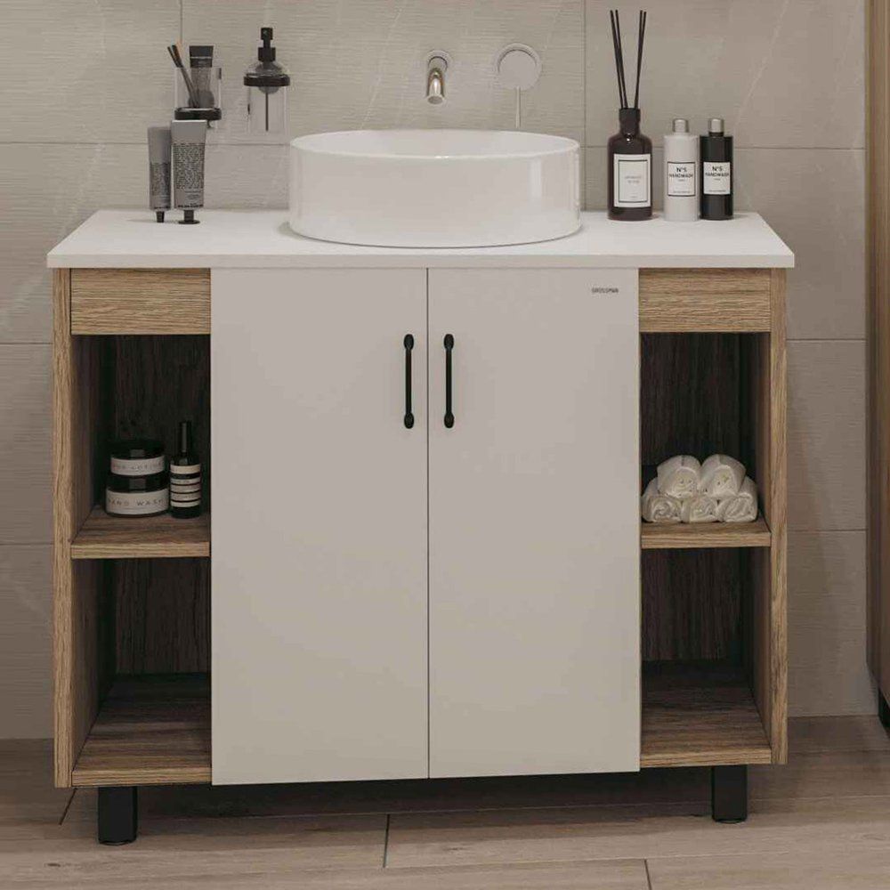 Тумба Grossman Флай 100 размером 101х47,5х78 см выполнена из ЛДСП с ламинатным покрытием в цвете дуб сонома и белым фасадом из МДФ. Она оснащена дверками и устойчивыми несъемными внутренними полками. Матовая черная фурнитура элегантно завершает образ. Столешница шириной 97,6 см с отверстием под смеситель изготовлена из МДФ с белой пленкой. Исключительная раковина диаметром 42,5 см выполнена из фаянса и приготовлена для сифона 3,2 см. Гарантия на раковину — 5 лет, произведено в Германии / Китае.