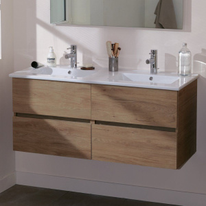 Комплект состоит из тумбы и раковины, произведенных во Франции. Тумба Jacob Delafon Tolbiac 120 изготавливается из МДФ с дубовым ламинатным покрытием, способным выдерживать условия высокой влажности. Ее размеры составляют 118,5x45,6x52 см, что позволяет даже в небольшой ванной максимально эффективно использовать пространство. Модель поддерживает монтаж на стену и обладает механизмом доводчика, который дарит комфорт в использовании.