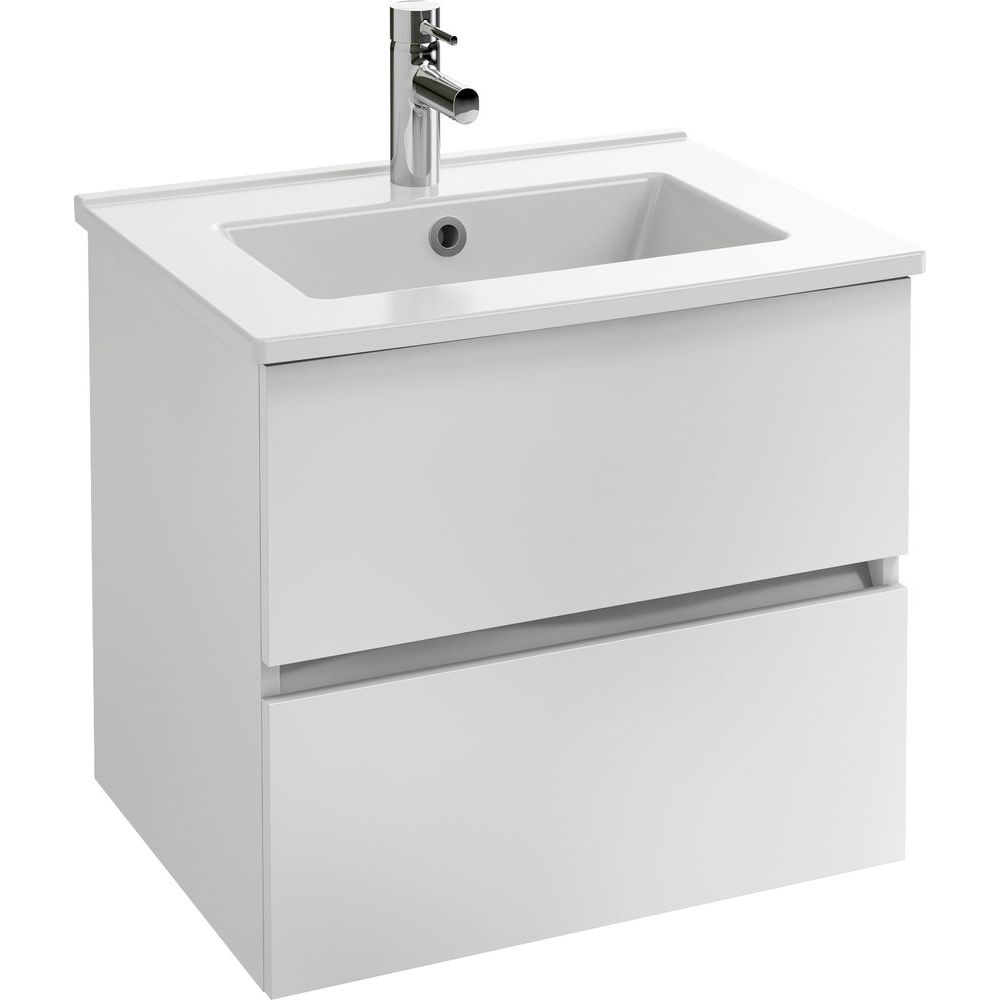 Тумба: выполнена из МДФ, покрытого эмалью, размером 58,5x45,6x52 см. Она оснащена ящиками с доводчиками и подходит для подвесного монтажа. Гарантия на изделие составляет 5 лет, произведена во Франции.
