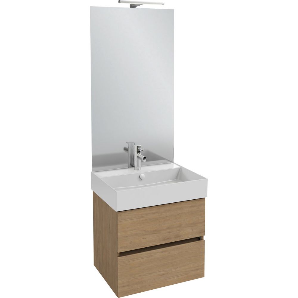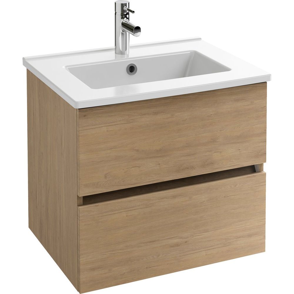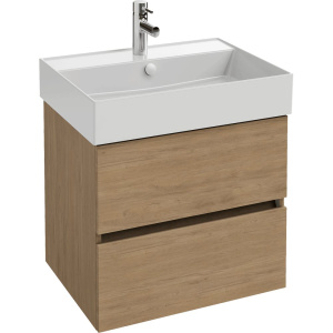 Тумба Jacob Delafon Tolbiac имеет габариты 58,5x45,6x52 см, выполнена из МДФ с ламинатным покрытием, и оснащена подвесной системой крепления. Ящики оснащены механизмом доводчика, что обеспечивает плавное закрывание. Раковина Jacob Delafon Ola с габаритами 61x46,5 см изготовлена из фарфора, обладает встроенным сливом-переливом и имеет готовое отверстие под смеситель диаметром 3.2 см. Обратите внимание, что донный клапан приобретается отдельно. Набор производится во Франции и поддерживается гарантиями в 5 лет на тумбу и 25 лет на раковину.