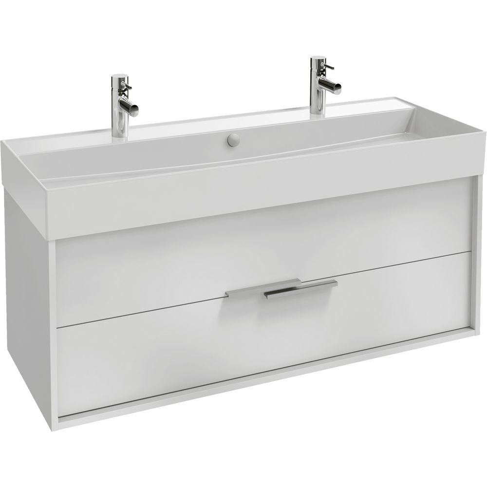 Тумба Jacob Delafon Vivienne EB1669-J5-J5 выполнена в подвесном варианте с габаритами 119,9x45,2x45,2 см. Она снабжена механизмом доводчика и имеет корпус и фасады из МДФ, покрытые эмалью. Цвет фурнитуры — сатин, а отделка ручек имеет хромово-сатиновую текстуру. В комплекте идут ящики с плавным закрыванием. Раковина Jacob Delafon Vivienne EXBK112-00 имеет размеры 121,2x46,6 см, изготовлена из фарфора и оснащена встроенным сливом-переливом с двумя отверстиями под смеситель. Однако донный клапан покупается отдельно. Раковина рассчитана на сифон диаметром 3,2 см и поставляется с гарантией 25 лет.