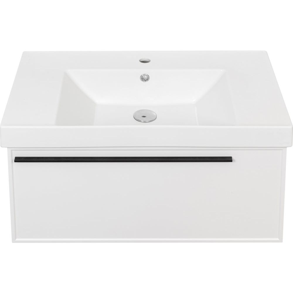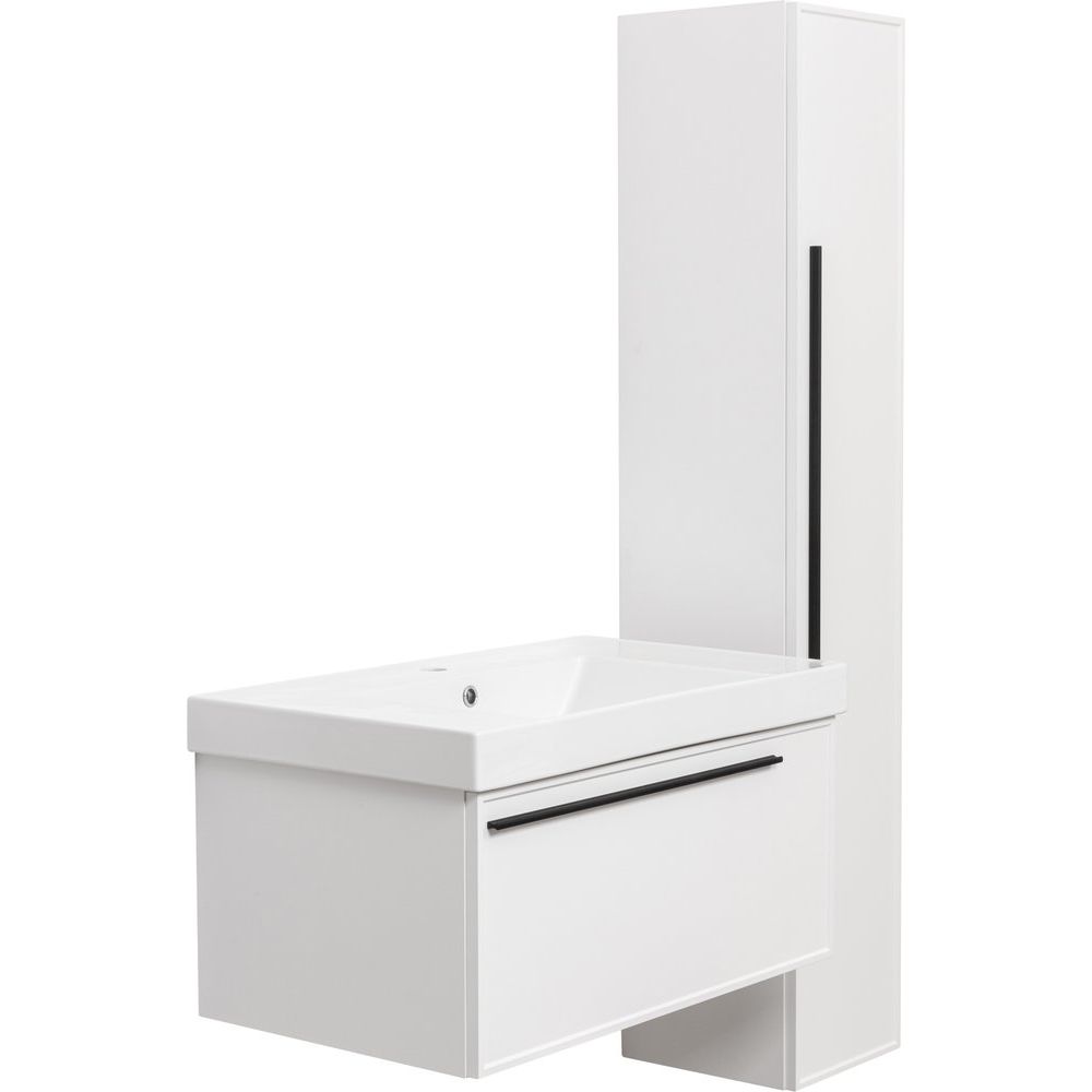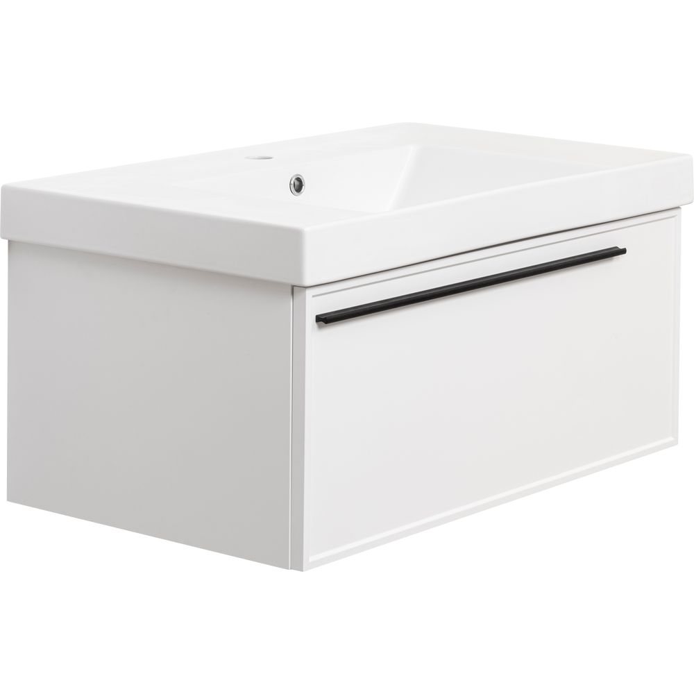 Тумба La Fenice Elba 80 белая выполнена из ЛДСП и эмалированного МДФ, что гарантирует устойчивость к влаге и долговечность. Размеры тумбы составляют 77,6x48,3x35 см, что делает её компактной, но вместительной. Черная фурнитура добавляет контраста и стиля. Мебельная раковина La Fenice Cubo 80, изготовленная из фаянса, имеет встроенный слив-перелив и готовое отверстие под смеситель. Параметры раковины - 80,5x48,5 см. Учитывайте, что донный клапан нужно приобретать отдельно. Гарантия на комплект составляет 2 года.