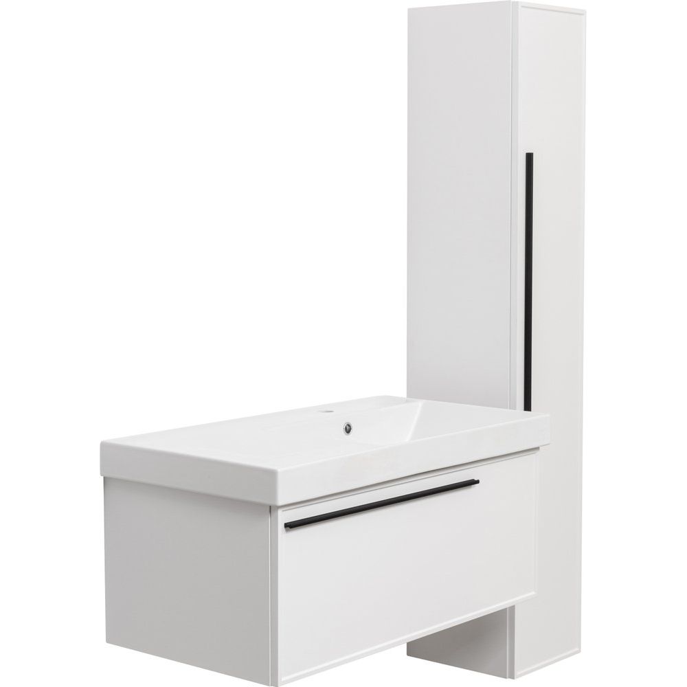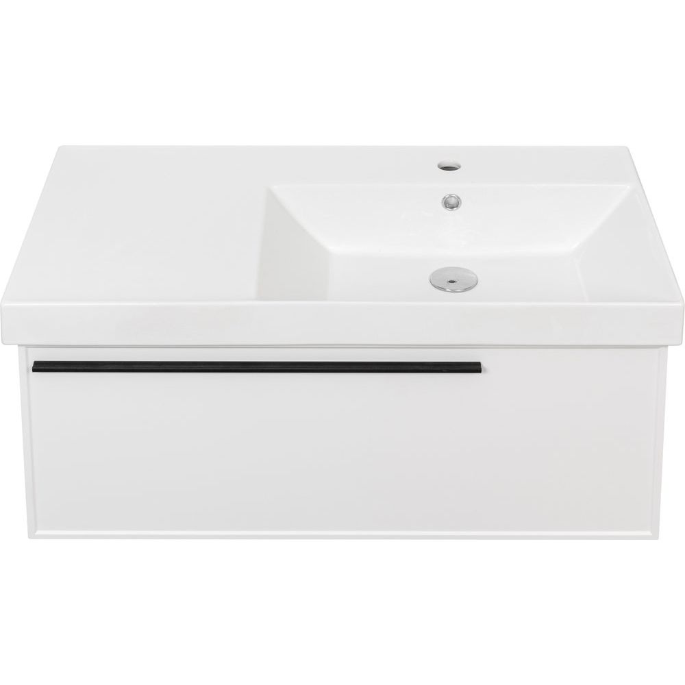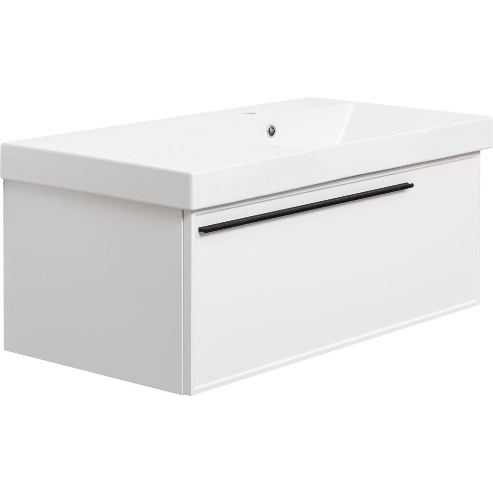 Тумба под раковину из коллекции Elba от La Fenice выполнена в белом цвете и имеет размеры 87,6x48,3x35 см. Модель подвесная и оснащена механизмом плавного закрывания ящиков. Корпус из ЛДСП и фасад из МДФ покрыты эмалью, а стильная черная фурнитура добавляет благородства.
