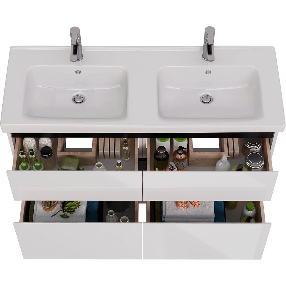 Тумба для комплекта Lemark Combi 120 имеет габариты 120x44,5x68,2 см и может быть как напольной, так и подвесной, что упрощает её установку. Мебель оборудована ящиками с доводчиками, которые обеспечивают тихое и плавное закрывание. Изготовленная из ЛДСП с эмалевым покрытием, она устойчива к влаге и долговечна. Раковина Гармония 125 имеет размеры 125,5x47 см и сделана из прочного фарфора. Она оснащена встроенным сливом-переливом и двумя отверстиями под смеситель, что облегчает процесс установки и использования.