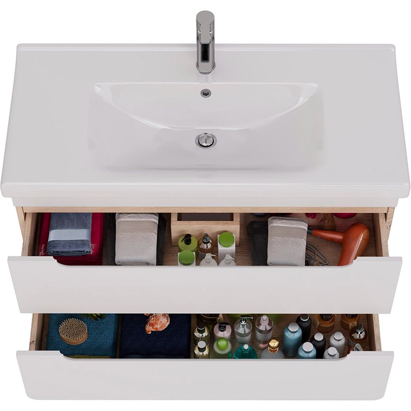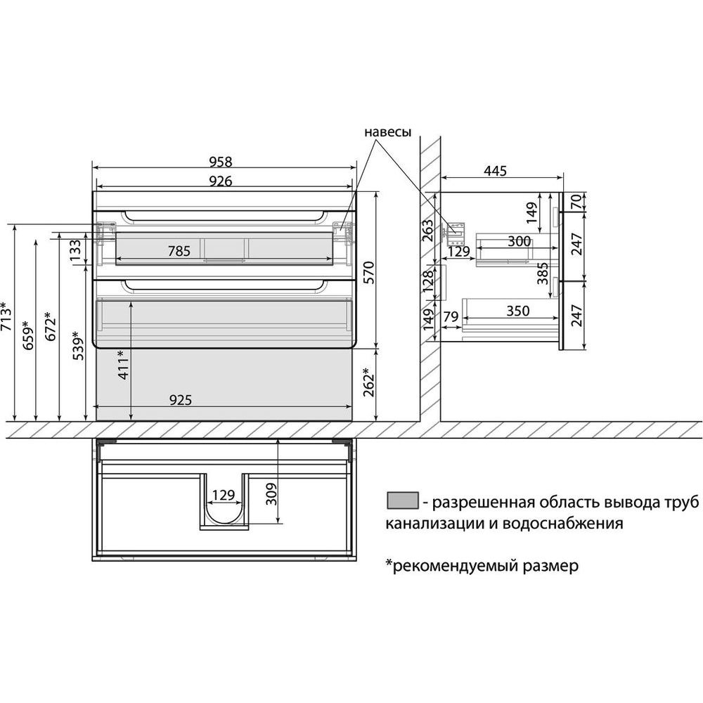 Мебель поставляется в собранном виде, что значительно упрощает установку. Обратите внимание на необходимость приобретения донного клапана отдельно. Также важно учитывать конструктивные особенности тумбы при выборе сифона — он должен быть совместим с параметрами данной модели.