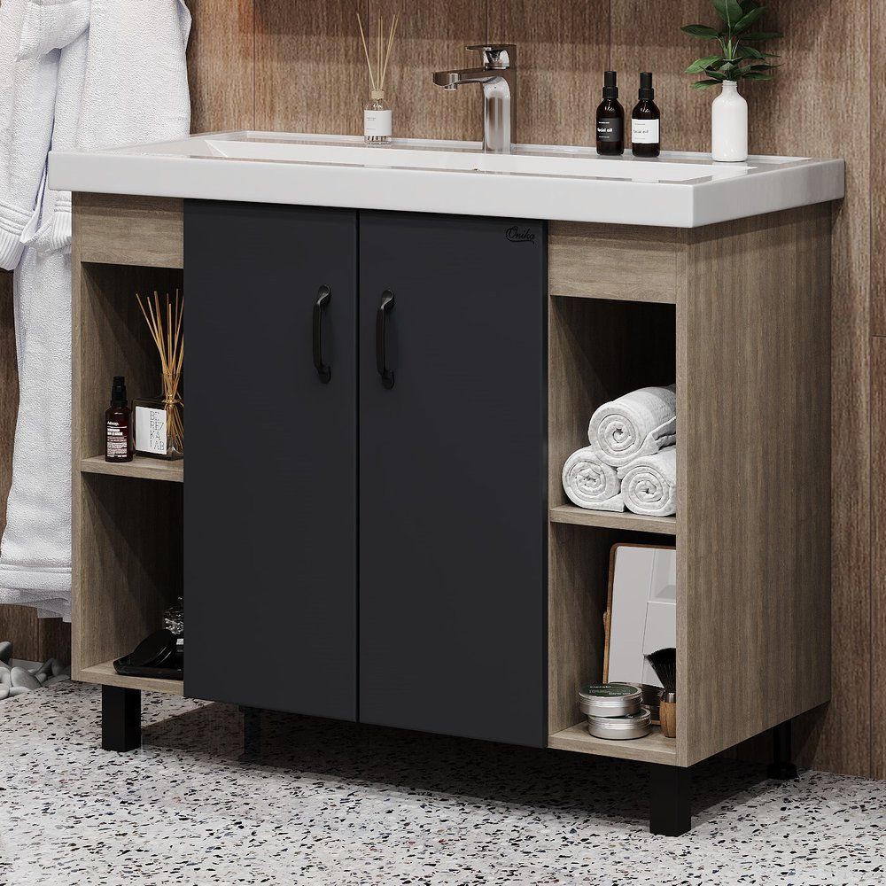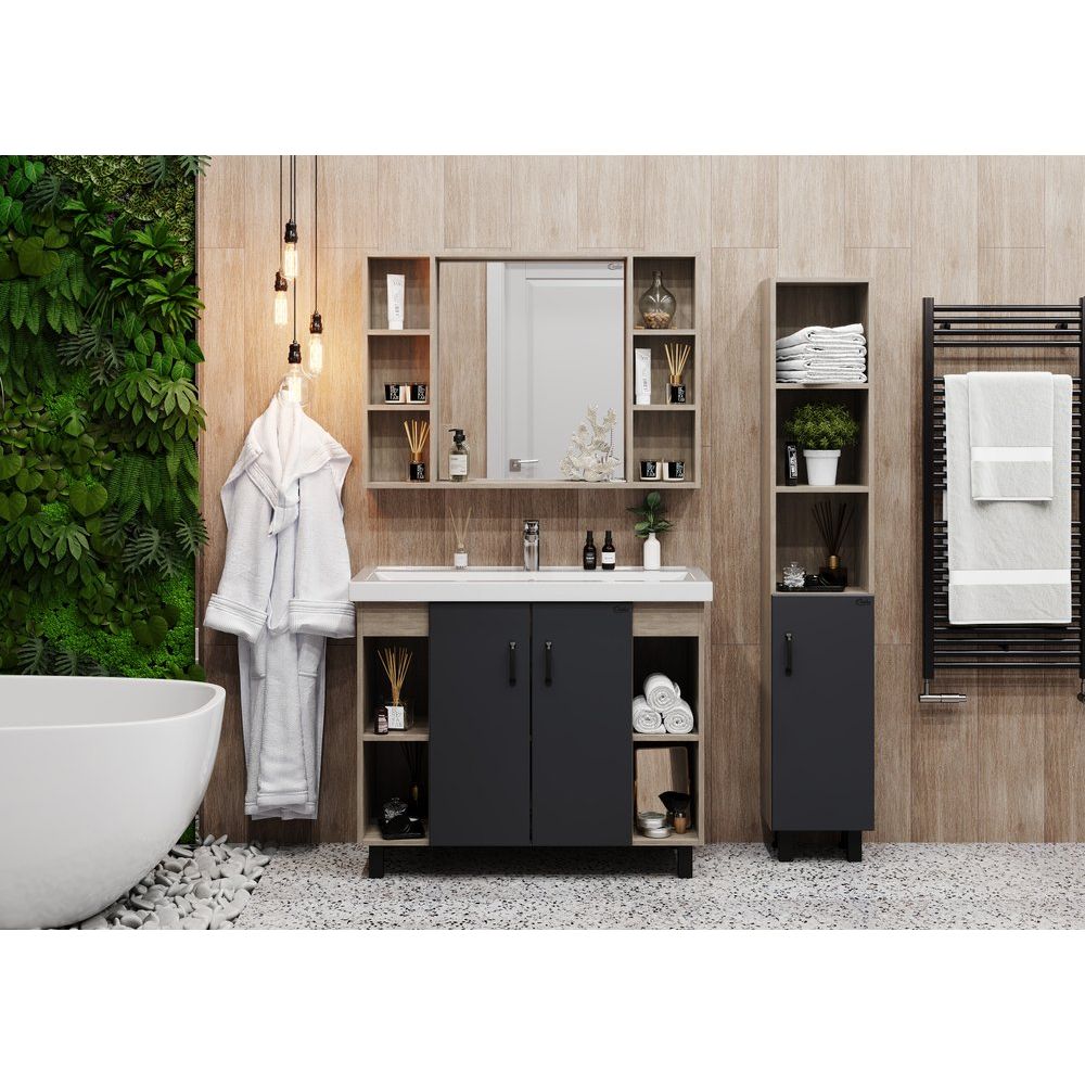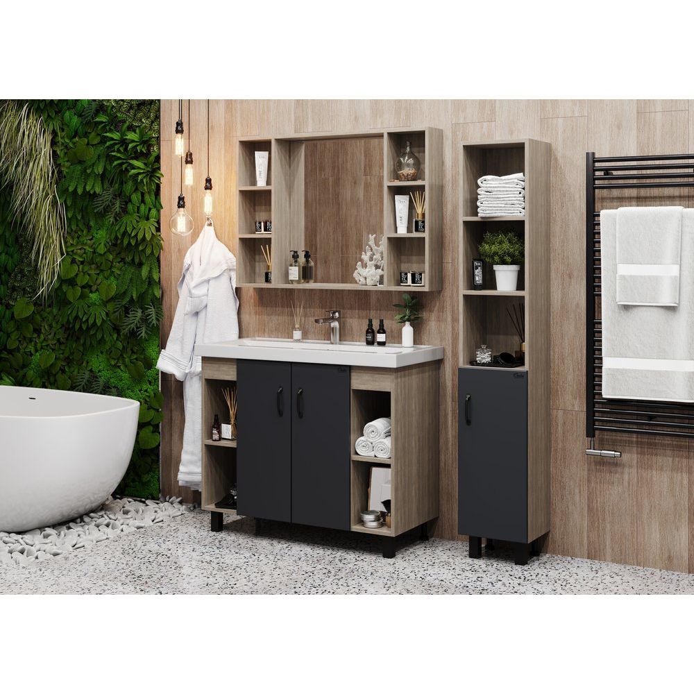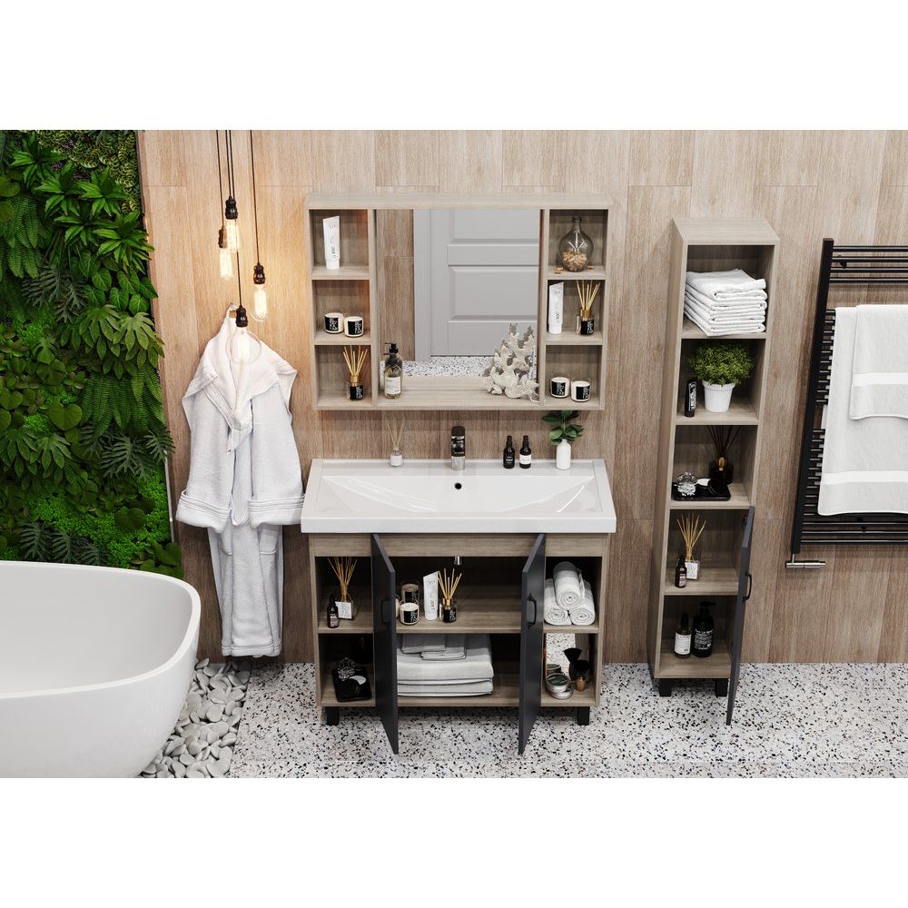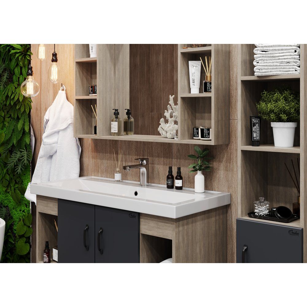 Тумба с раковиной Onika Тимбер 100 — это стильное решение для вашей ванной комнаты. Элегантное сочетание серого матового цвета и текстуры древесины дуба сонома создаёт атмосферу уюта и современности. Изделие не только радует глаз, но и обладает практичностью: продуманные внутренние полки обеспечивают удобное хранение всех необходимых принадлежностей. Фасад выполнен из прочного МДФ с покрытием из пленки, что гарантирует долговечность и устойчивость к повышенной влажности, характерной для ванных комнат.