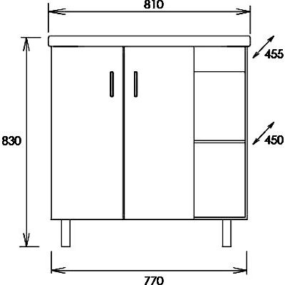 Тумба выполнена в габаритах 77х45х83 см и является напольной конструкцией. Корпус сделан из ЛДСП и ДСП с ламинатным покрытием, а фасад — из МДФ, покрытого пленкой. Она оснащена черной фурнитурой, дверками и открытыми полками для удобного хранения. Мебельная раковина Kirovit Фостер, размером 81x45,3 см, выполнена из фаянса, имеет встроенный слив-перелив и одно отверстие под смеситель. Чтобы упростить установку, в комплект включен слив-перелив.