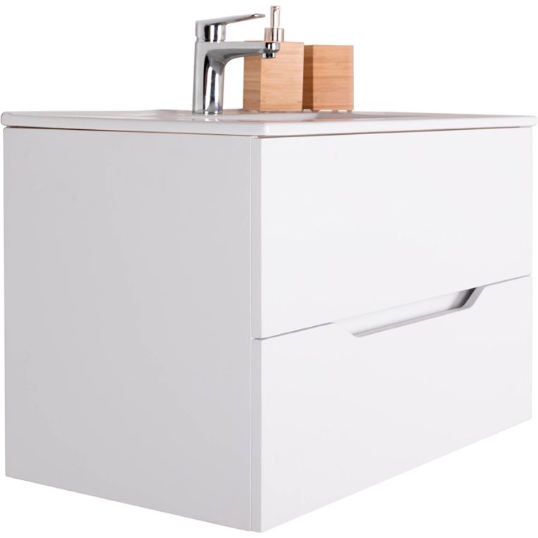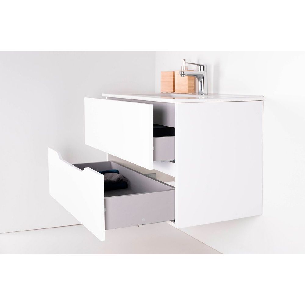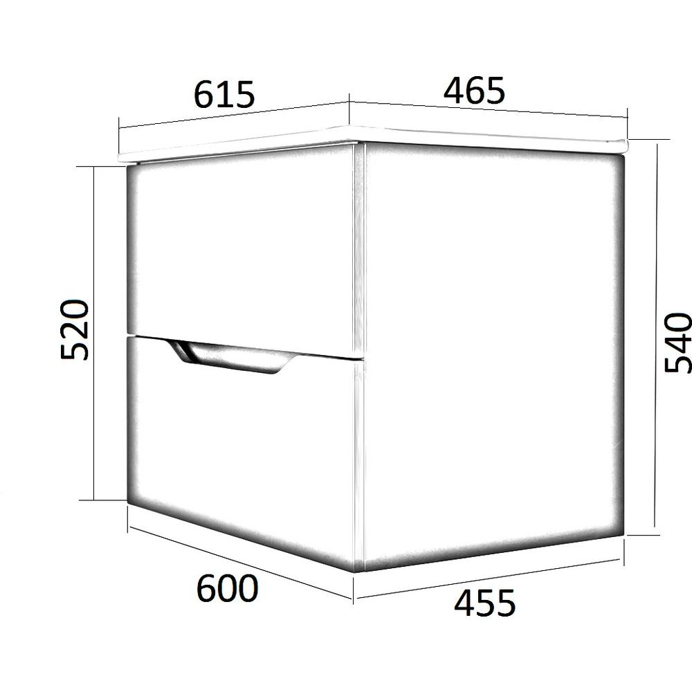 Комплект включает тумбу с раковиной. Тумба имеет размеры 60x45,5x52 см и выполнена из МДФ с пленочным покрытием, что обеспечивает дополнительную устойчивость к влаге. Подвесная конструкция позволяет сэкономить пространство и облегчает уборку. Ящики оснащены механизмом доводчика для плавного закрывания, что увеличивает срок службы. Гарантия на тумбу — 2 года.