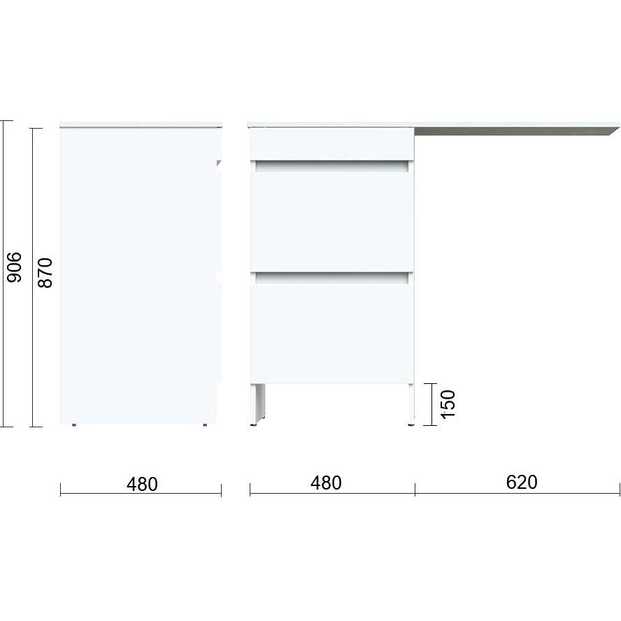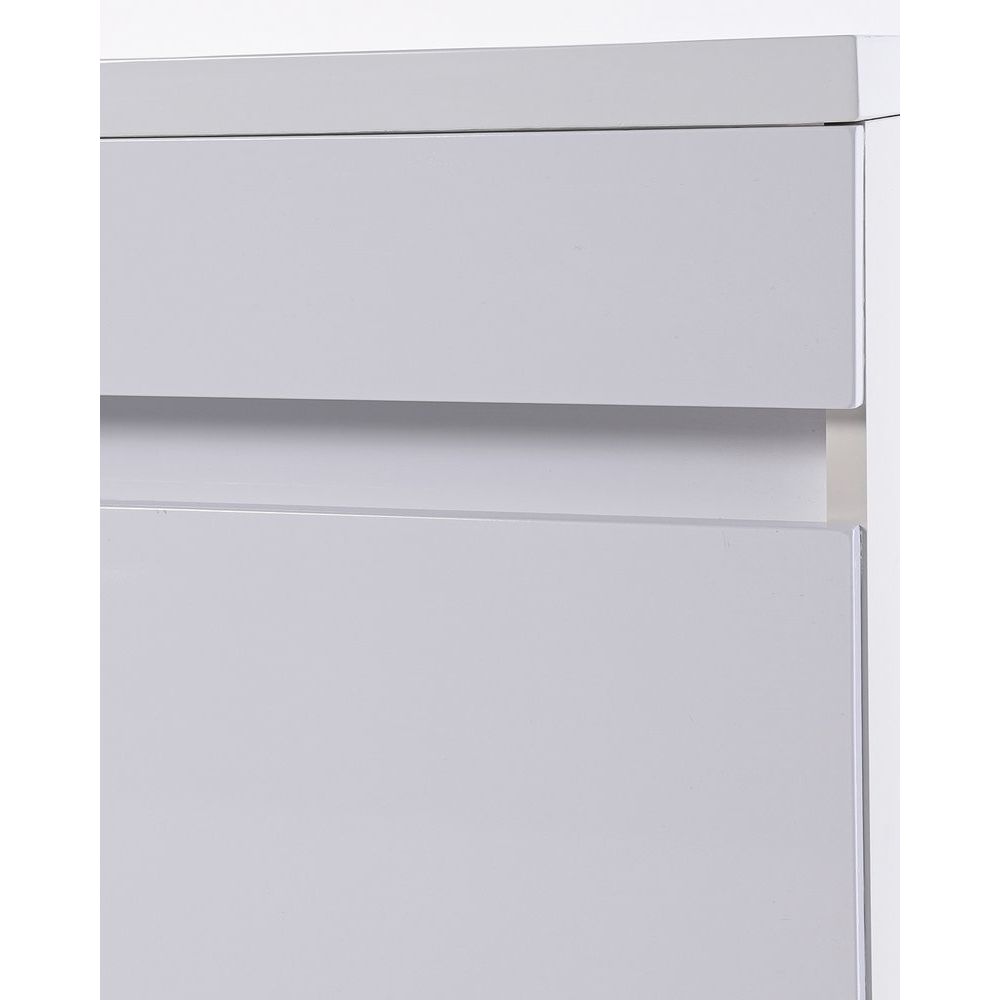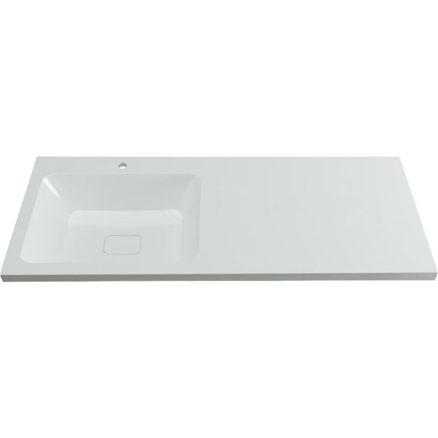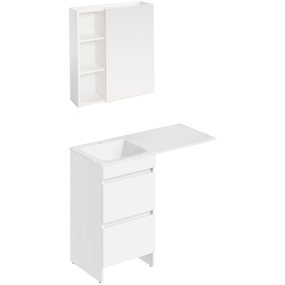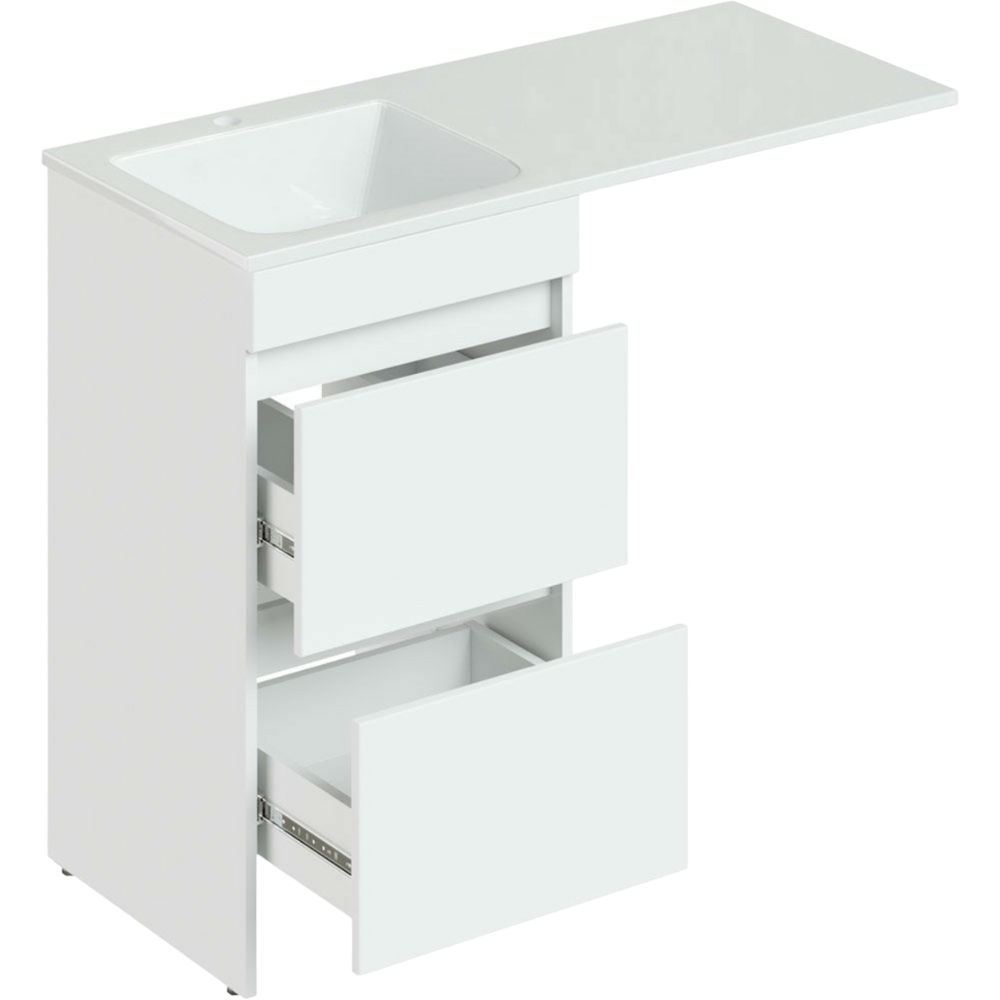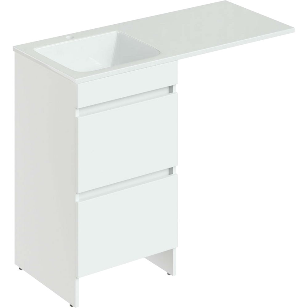 Тумба с размерами 48x48x87 см удобно размещается на полу и оснащена ящиками для хранения. Корпус выполнен из ЛДСП с ламинатным покрытием, а фасад из МДФ, покрытый пленкой, придает изделию стильный белый глянцевый вид. Система без механизма доводчика обеспечивает легкое открывание и закрывание ящиков. Раковина с параметрами 110x48 см выполнена из искусственного камня и готова к установке смесителя благодаря уже имеющемуся отверстию диаметром 3,2 см. Прочная конструкция дополнительно укреплена кронштейном для надежного монтажа.