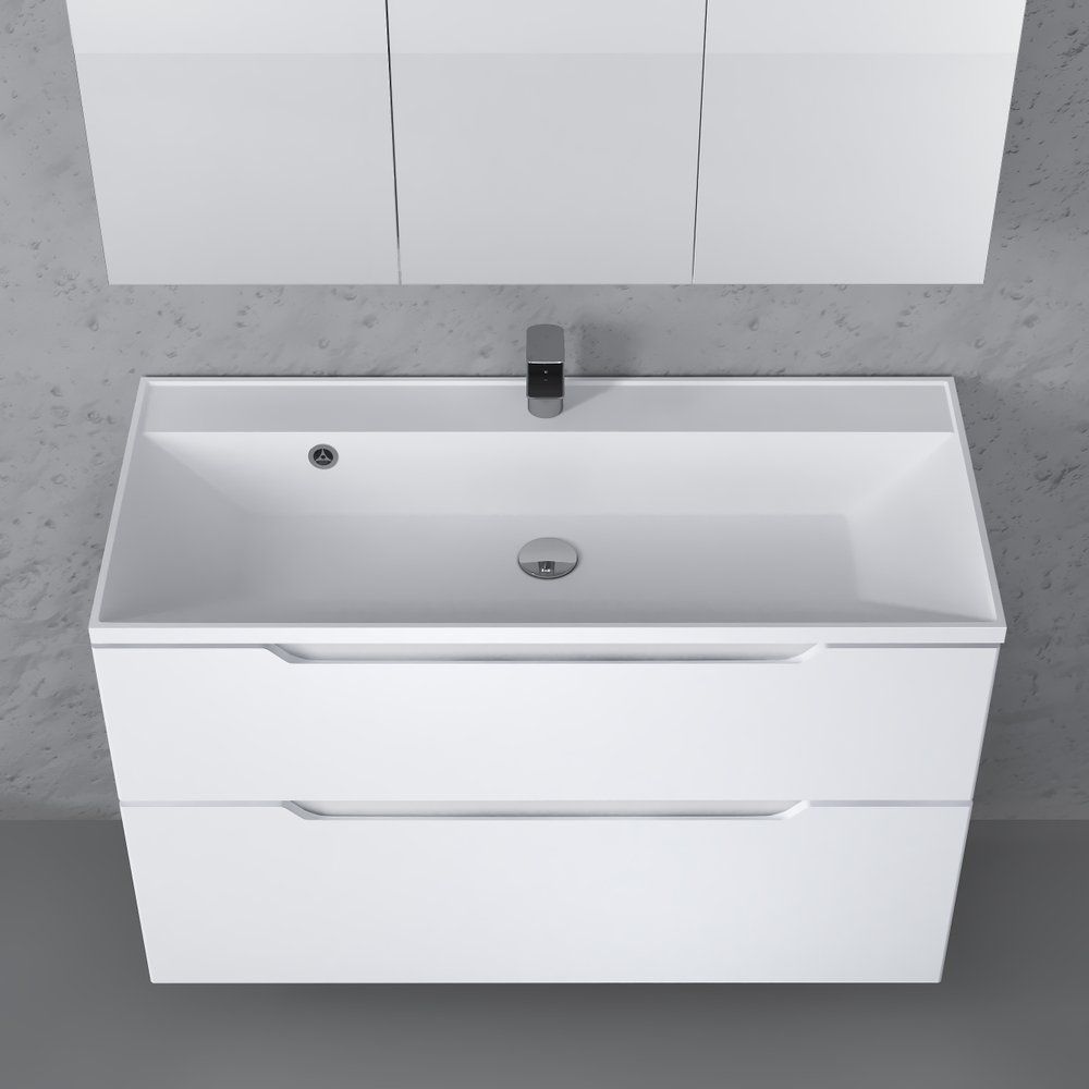 Тумба для комплекта Raval Wector 100 представлена в подвесном исполнении, имеет размеры 99 см в ширину, 44,5 см в глубину и 60 см в высоту. Корпус и фасад выполнены из прочного МДФ с надежным пленочным покрытием. Оснащена ящиками с механизмом доводчика, что делает их использование максимально комфортным. Изделие произведено в России и сопровождается гарантией на 2 года. Мебельная раковина Raval Classica 100 гармонично дополняет тумбу. Она выполнена из искусственного мрамора, имеет размеры 100,25 см в ширину и 45 см в глубину. Комплект включает в себя арматуру для слива-перелива и одно отверстие под смеситель. Подходит для сифона диаметром 3,2 см, который нужно приобретать отдельно. Производитель также предоставляет гарантию 2 года.
