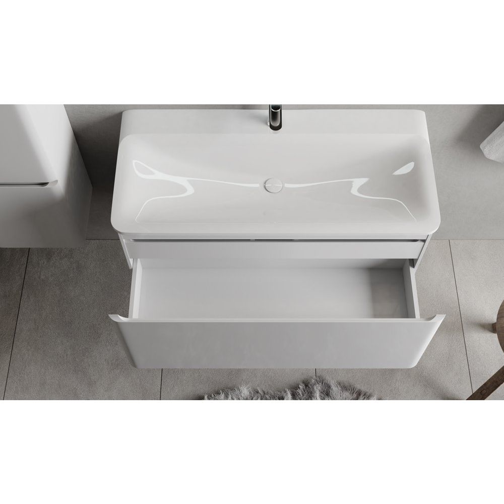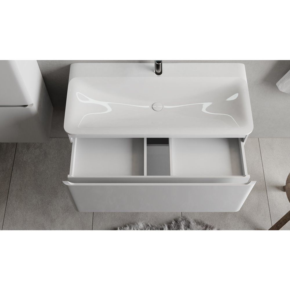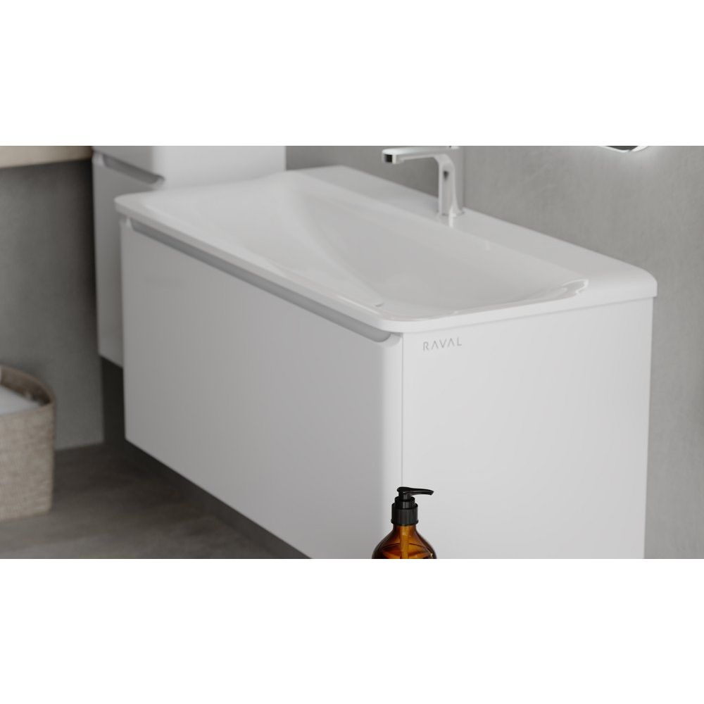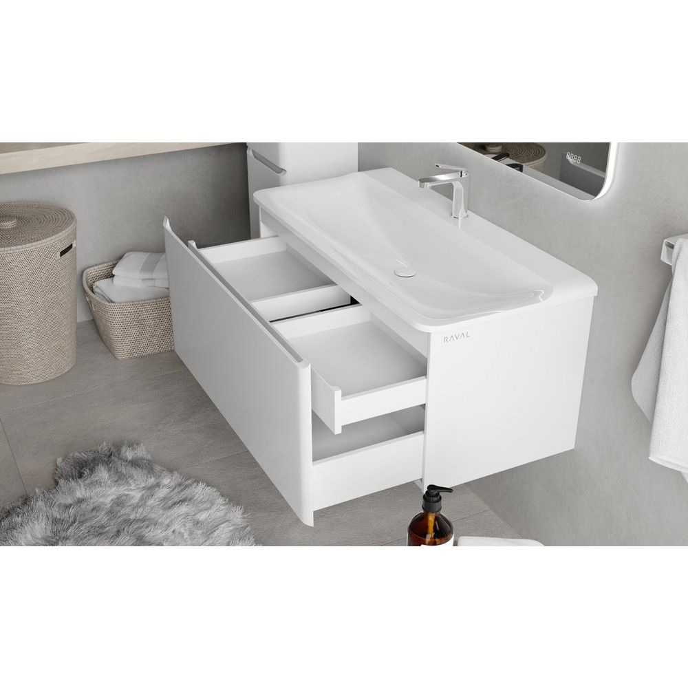 В комплект Raval Welto 100 входит подвесная тумба с ящиками и мебельная раковина из искусственного мрамора. Габариты тумбы составляют 98,6x45x42 см, она выполнена из МДФ с покрытием из пленки. Раковина имеет размеры 100x45,5 см и готовое отверстие под смеситель. Диаметр сифона составляет 3.2 см, и стоит учитывать, что донный клапан необходимо приобрести отдельно. Гарантия на всю продукцию — 2 года.