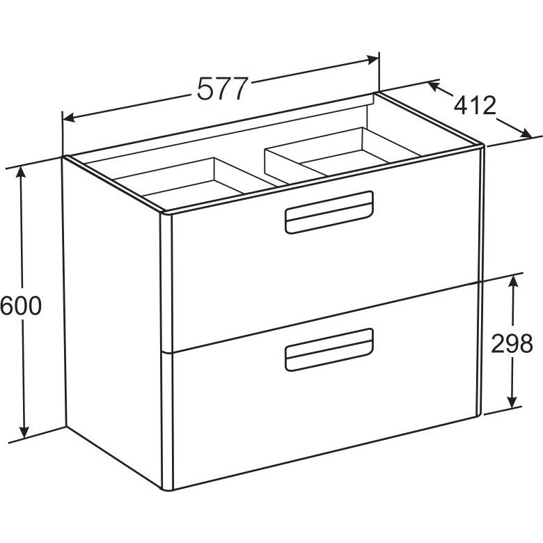 - Тумба: 57,7x41,2x60 см, МДФ с матовым пленочным покрытием, оборудована дизайнерскими хромированными ручками и системой доводчиков.