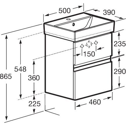 Тумба под раковину Roca Oleta имеет габариты 46x37,4x54,8 см и предназначена для подвесного монтажа, что экономит пространство и упрощает уборку. Корпус и фасад выполнены из ЛДСП с применением эмали и ламината, обеспечивая защиту от влаги и долговечность. Раковина размером 50x39 см изготовлена из высококачественного фарфора и оснащена встроенным сливом-переливом. В комплект входит одно готовое отверстие для смесителя, а также предусмотрено место для сифона диаметром 3.2 см.