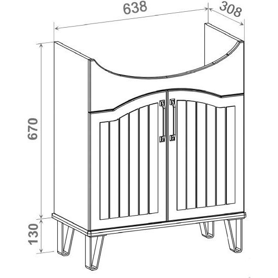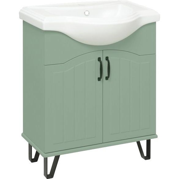 Тумба для комплекта из коллекции Марсель имеет габариты 63,8x30,8x80 см. Она напольная и оснащена механизмом доводчика для мягкого закрывания дверок. Корпус выполнен из ЛДСП и покрыт ламинатом, а фасад — из МДФ с пленочным покрытием. Черная фурнитура придает изделию элегантности. В комплекте идет раковина Kirovit Классик 65. Ее габариты — 66x41,5 см, материал — фаянс, и она оснащена встроенным сливом-переливом с одним отверстием под смеситель. Приобрести донный клапан необходимо отдельно. На изделие предоставляется 10 лет гарантии.