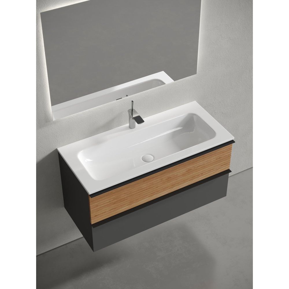 Тумба изготовлена из прочного МДФ с пленочным покрытием. Габариты изделия составляют 99,5x44,5x50 см, позволяя удобно разместить его даже в компактных пространствах. Подвесная установка делает уборку проще и лаконичнее. Механизм доводчика обеспечивает плавное закрывание ящиков, исключая ненужные шумы. Раковина от Ceramicanova Element с размерами 101x45,7 см выполнена из изящного фаянса и рассчитана на сифон диаметром 3.2 см. Итальянское качество раковины подтверждено десятилетней гарантией.
