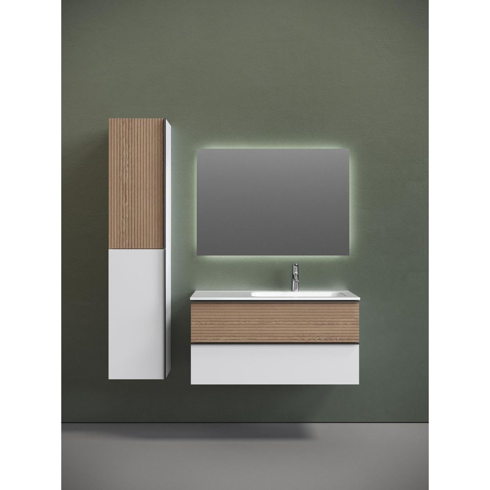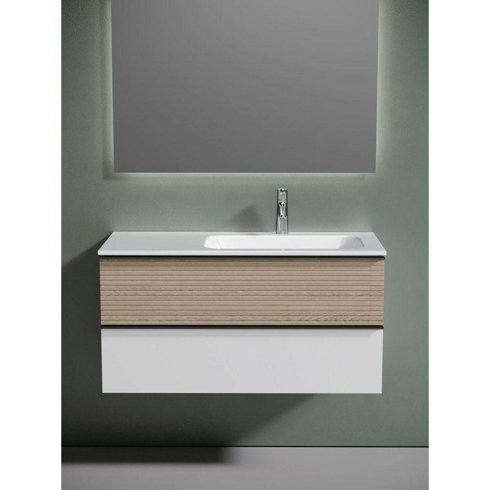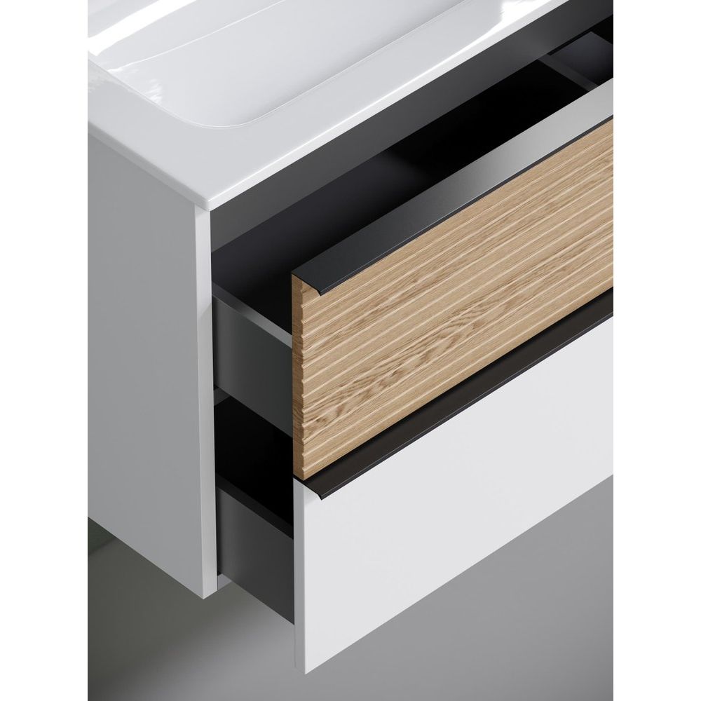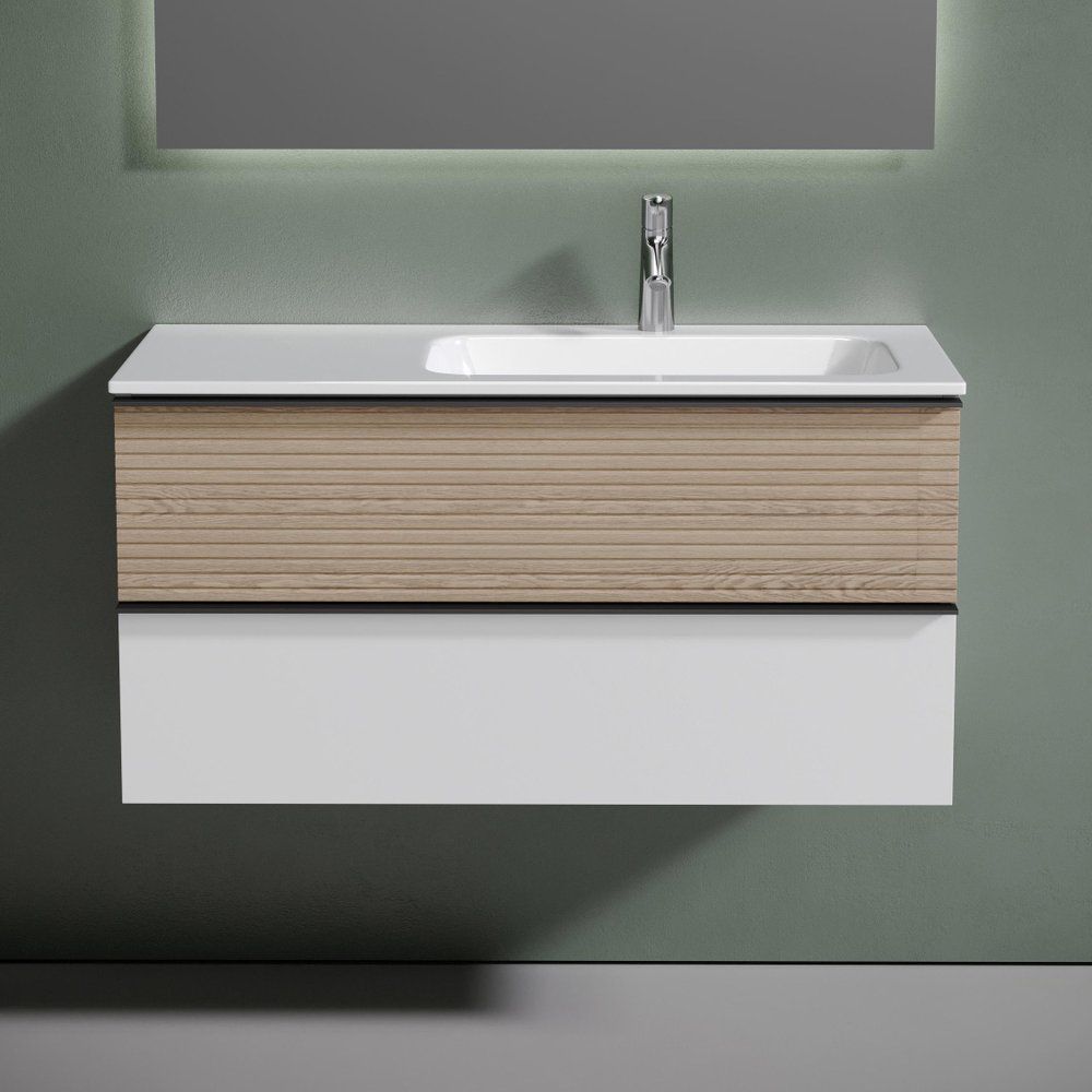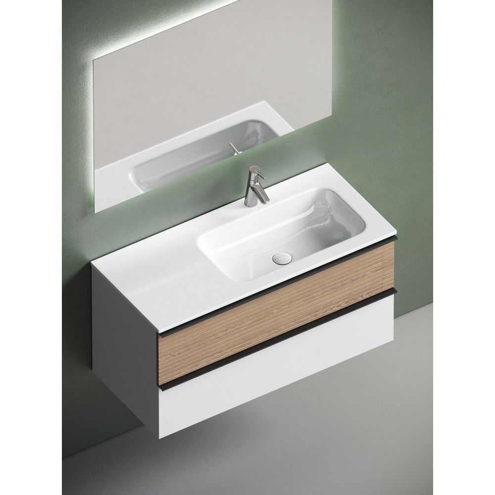 Тумба Sancos Delta 100 R, выполненная в цвете «дуб светлый, белый», имеет габариты 99,5x44,5x50 см и предназначена для подвесной установки. Корпус и фасад изготовлены из МДФ с пленочным покрытием, придающим изделиям большую устойчивость к влаге. Матовый черный — цвет фурнитуры, который придает изделиям современный вид. Раковина Ceramicanova Element CN7015, размером 101x45,7 см, изготовлена из прочного фаянса и подходит для сифона диаметром 3.2 см. Продукция разработана для долгосрочной эксплуатации и имеет гарантию до 10 лет.
