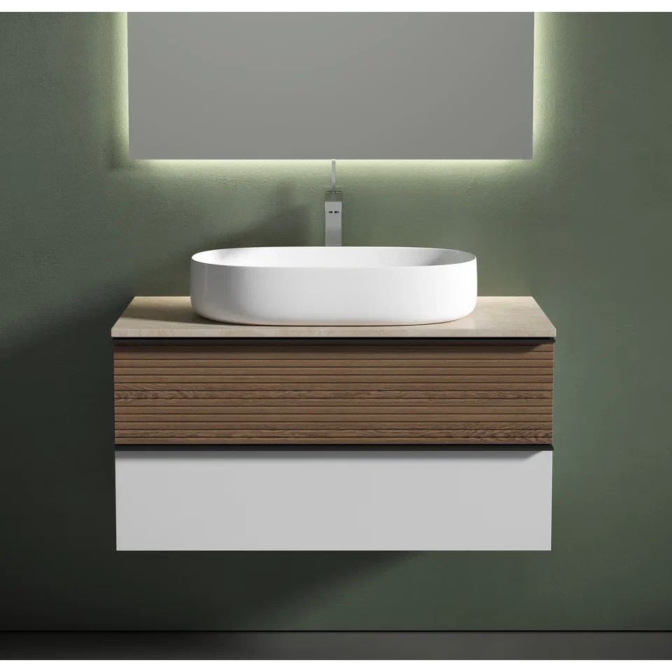 Тумба Sancos Delta выполнена из МДФ с пленочным покрытием в оттенке светлого дуба и белого цвета. Размеры тумбы составляют 99,5x44,5x50 см, и она поддерживает подвесную установку. Механизм доводчика в ящиках обеспечивает плавное и бесшумное закрытие. Фурнитура выполнена в матовом черном цвете, добавляя акцент элегантности. Столешница из керамогранита, в бежевом цвете размером 100x46x2.1 см, не имеет готовых и намеченных отверстий под смеситель, что упрощает процесс адаптации к индивидуальному интерьеру. Раковина Ceramicanova Element CN5022 из фаянса подходит для сифона диаметром 3.2 см, при этом донный клапан необходимо приобрести отдельно. Этот элемент производится в Италии и дает 10-летнюю гарантию качества.