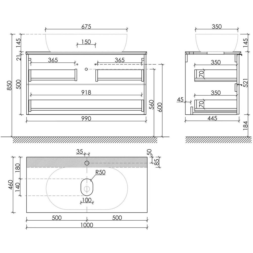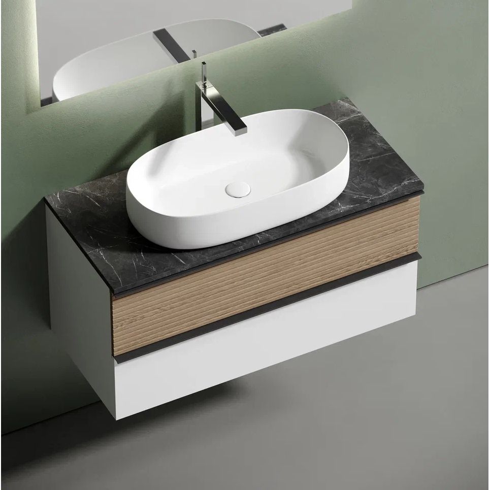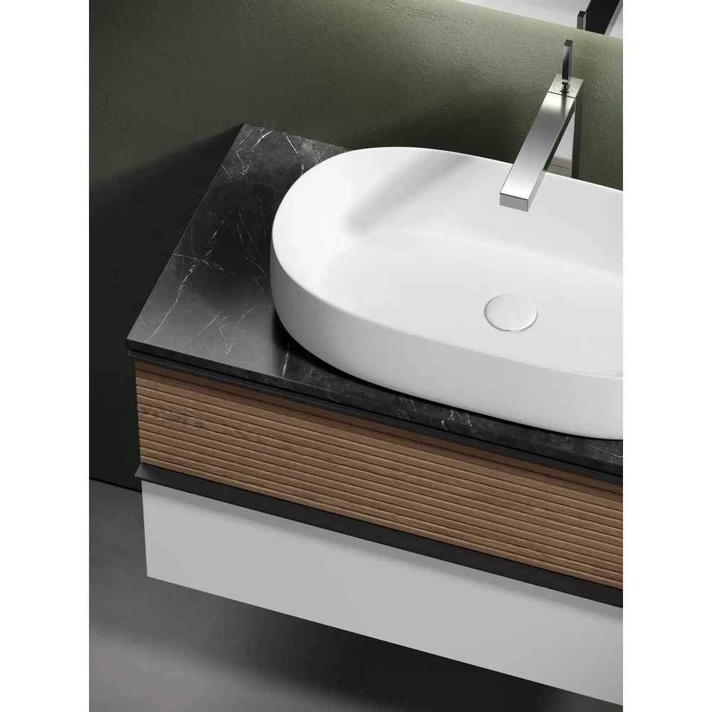 Тумба изготовлена из МДФ с пленочным покрытием, что обеспечивает дополнительную защиту от влаги и долговечность. Ее размеры составляют 99,5 см в ширину, 44,5 см в глубину и 50 см в высоту. Черная фурнитура придает элегантный оттенок всей конструкции. Установленная раковина Ceramicanova Element имеет размеры 67,5x35 см и выполнена из прочного фаянса, который легко чистится и сохраняет свой безупречный вид долгие годы. Особая прочность столешницы из керамогранита подчеркнута визуально эффектным черным мрамором. Габариты столешницы — 100x46x2,1 см.