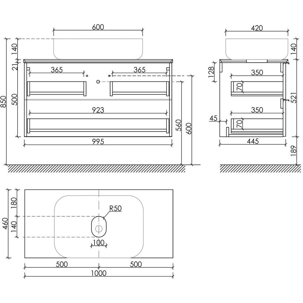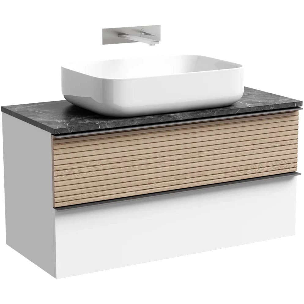 Тумба с раковиной имеет размеры 99,5x44,5x50 см, которая крепится на стену, обеспечивая легкость уборки и современный вид. Корпус и фасады выполнены из МДФ, покрытого пленкой для дополнительной защиты и долговечности. Цвет матовой черной фурнитуры добавляет изделию стильности. Ящики оснащены механизмом доводчика для комфортного использования.
