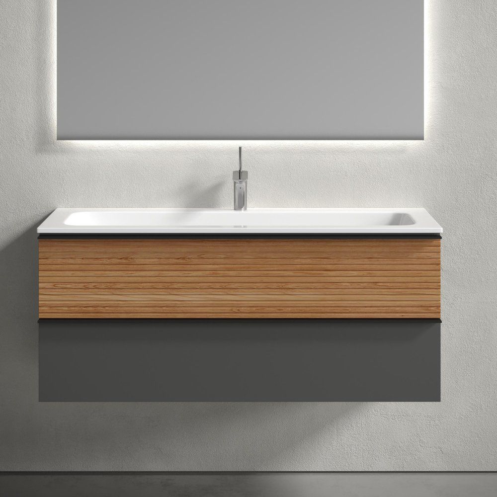 Тумба Sancos Delta 120 обладает продуманными размерами 119,5x44,5x50 см и выполнена из прочного МДФ, обтянутого пленкой для долговечности и устойчивости к влаге. Сочетание красного дуба и графитового оттенка фасада придает ей современный облик, а матовая черная фурнитура добавляет стильности. Раковина Ceramicanova Element CN7017, размером 121x45,7 см, выполнена из фаянса и имеет подготовленное отверстие под смеситель. При этом гарантия на раковину составляет целых 10 лет, что свидетельствует о ее высокой надежности.