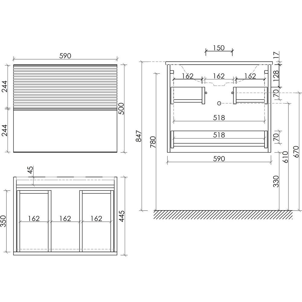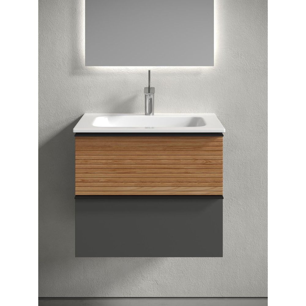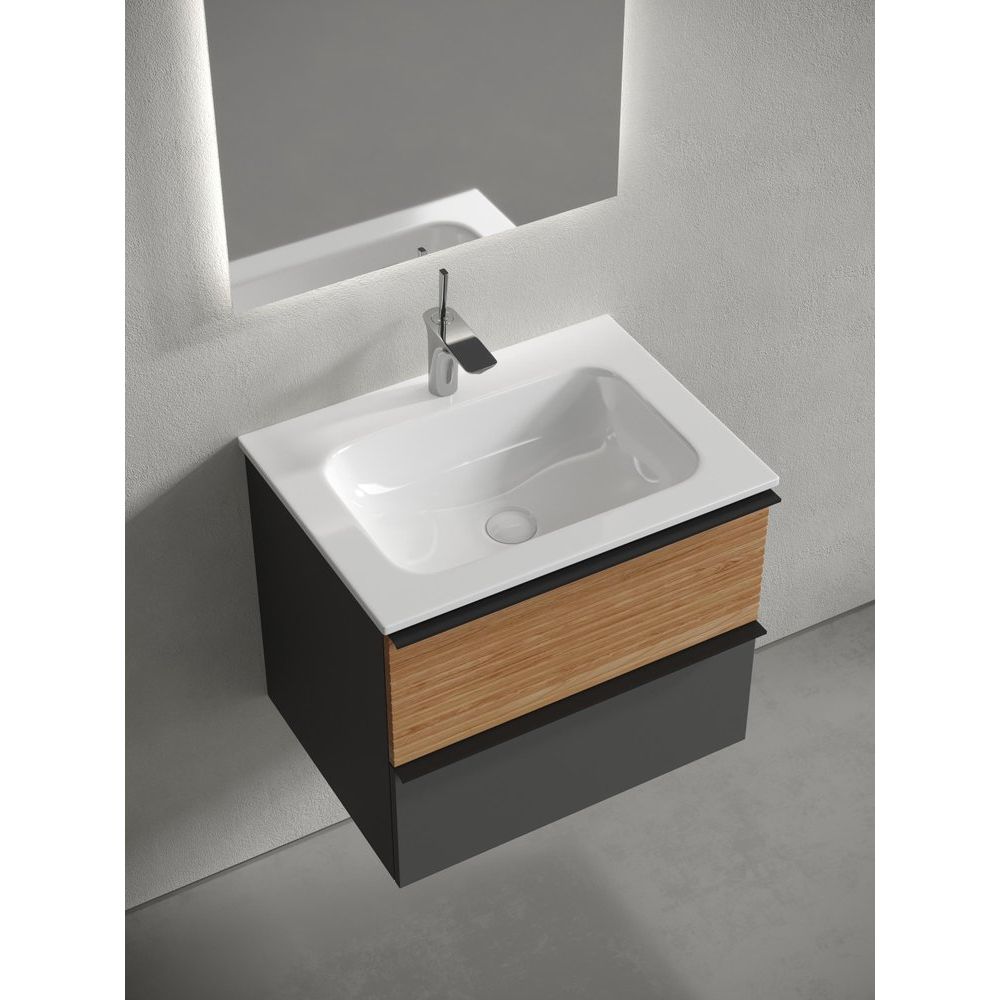 Тумба Sancos Delta имеет размеры 59x44,5x50 см и выполнена из МДФ с пленочным покрытием, что обеспечивает высокую стойкость к влажности. Ящики оснащены доводчиком, фурнитура имеет матовое черное покрытие, что добавляет элегантности. Раковина Ceramicanova Element CN7011 из фаянса с размерами 61x45,7 см сделана с готовым отверстием под смеситель и совместима с сифоном диаметром 3.2 см.