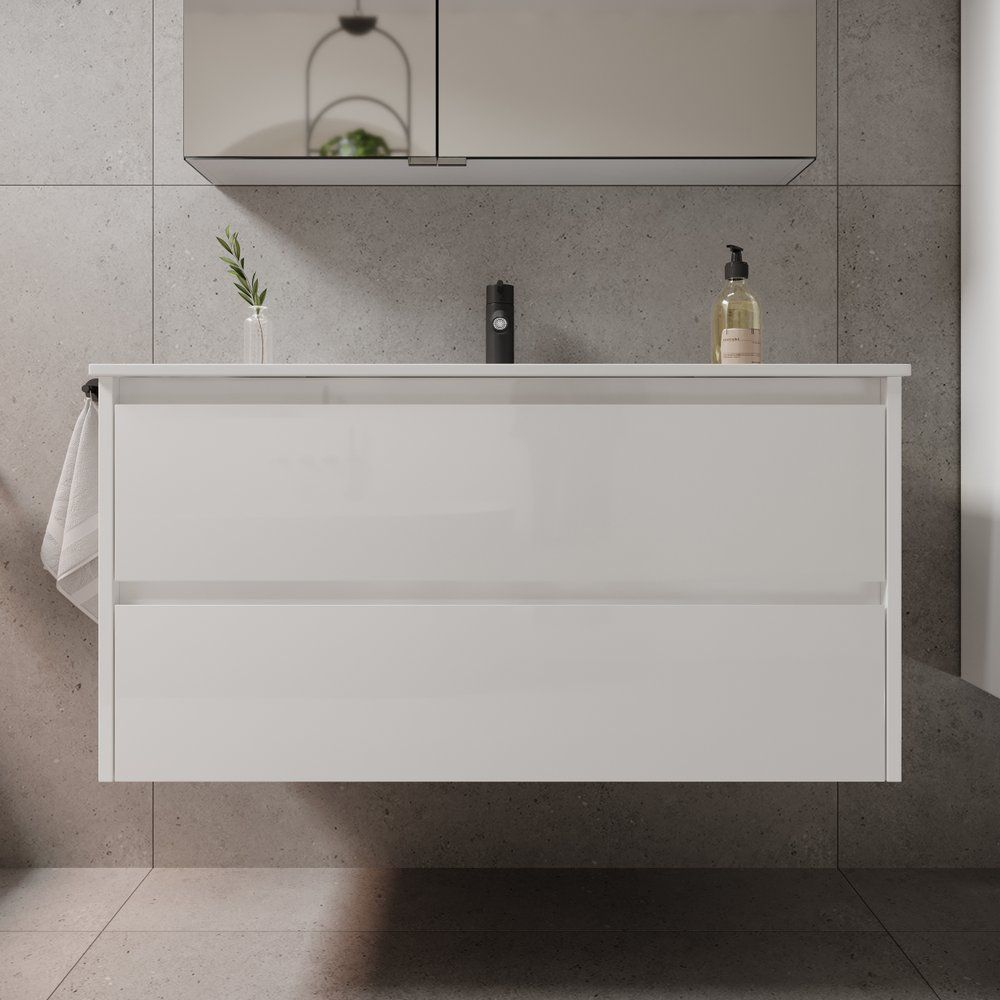 Тумба из коллекции Sancos Libra имеет размеры 99x45x50 см и выполнена в подвесной конструкции для экономии пространства. Корпус и фасады изготовлены из МДФ и покрыты стойкой эмалью, которая придает поверхности защитные свойства и блеск. Встроенные доводчики обеспечивают мягкое и тихое закрывание ящиков, что способствует комфорту использования.