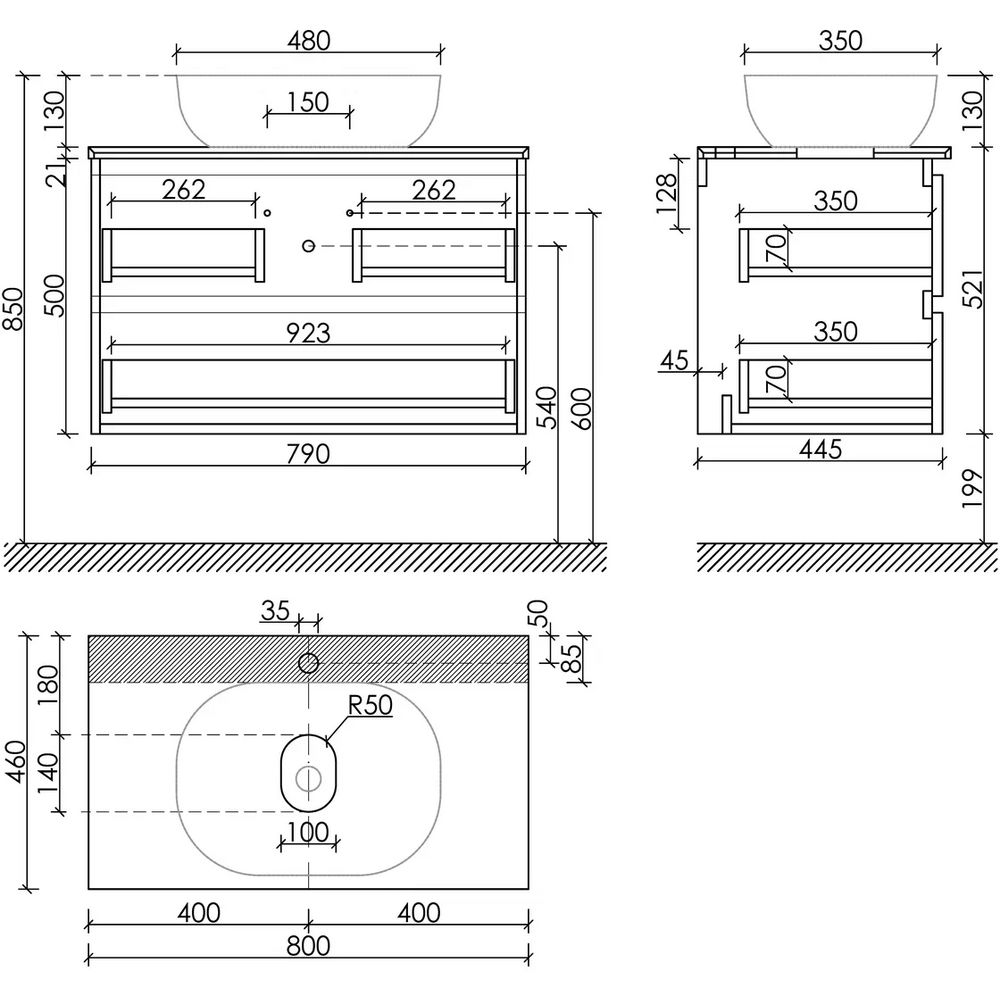 Тумба для комплекта Sancos Snob R 80 см выполнена из МДФ с пленочным покрытием, предлагая прочность и устойчивость к влаге. Ее габариты — 79x44,5x50 см, что делает ее компактной, но вместительной. Подвесная конструкция оснащена механизмом доводчика, обеспечивающим мягкое закрывание. Столешница из керамогранита имеет размеры 80x46x2.1 см и готовое отверстие под смеситель. Раковина Ceramicanova Element CN5010 размером 48x35 см выполнена из фаянса, предлагая исключительное качество и стиль в каждом изгибе.