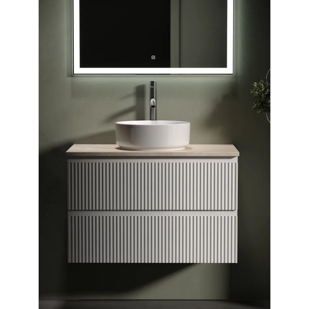 Тумба Sancos Snob R 80, представлена в размерах 79x44,5x50 см, изготовлена из МДФ и покрыта пленкой для увеличенной защиты от влаги. Это подвесная конструкция с ящиками на механизме доводчика, обеспечивающим комфортное использование. Гарантия на изделие составляет 2 года. Раковина Ceramicanova Element CN5001 с габаритами 36x36 см выполнена из фаянса и совместима с сифонами диаметром 3.2 см. Столешница, выполненная из бежевого керамогранита и размером 80x46x2.1 см, поставляется без отверстий для смесителя и предназначена для установки на консоли без кронштейнов.