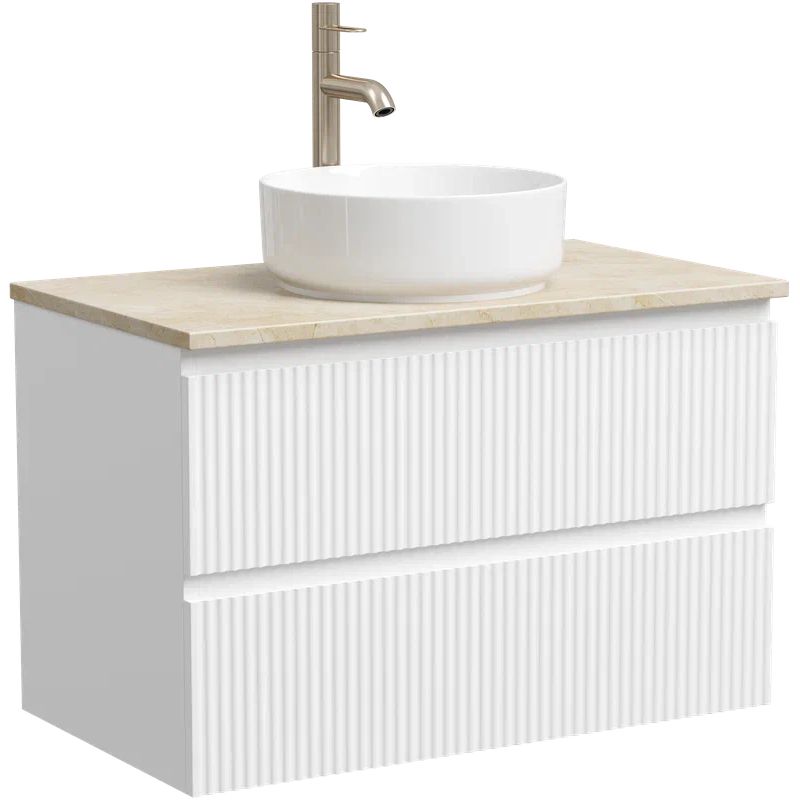 - Элегантный дизайн: тумба в цвете bianco и бежевая столешница из керамогранита.