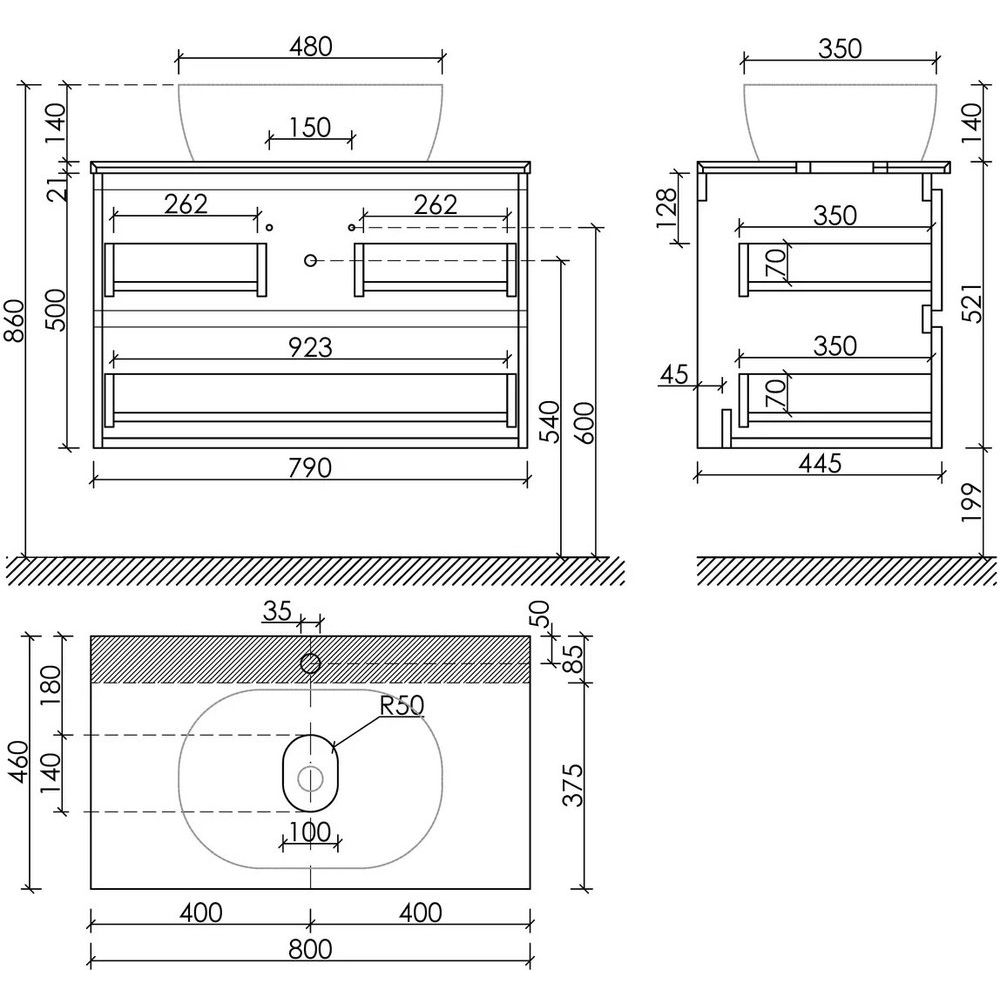 При выборе сифона учитывайте конструкцию тумбы, чтобы подобрать подходящий по параметрам вариант. Столешница предусмотрена с отверстием для установки раковины, но поставляется без отверстий под смеситель, что позволяет выбрать индивидуальное расположение. Это добавляет гибкости в планировке вашей ванной комнаты.