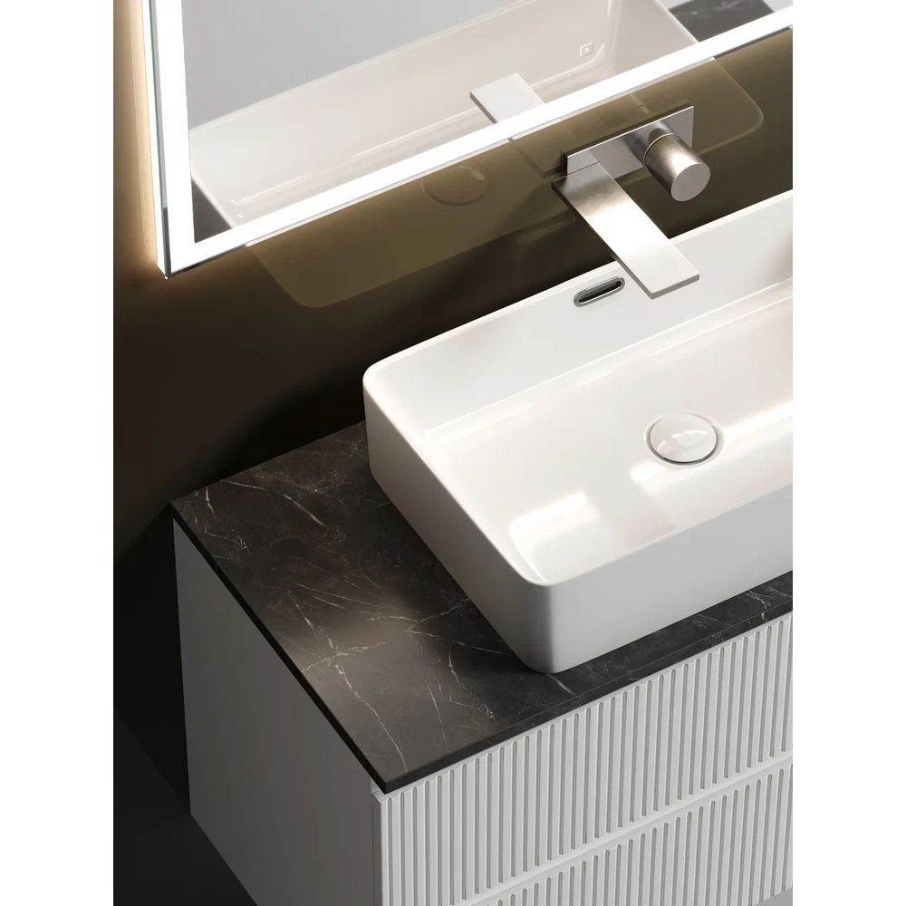 Столешница из керамогранита цвета черный мрамор, обладает размерами 100x46x2,1 см и придает изделию роскошный вид. Обратите внимание, что она не имеет готовых отверстий для установки смесителя.