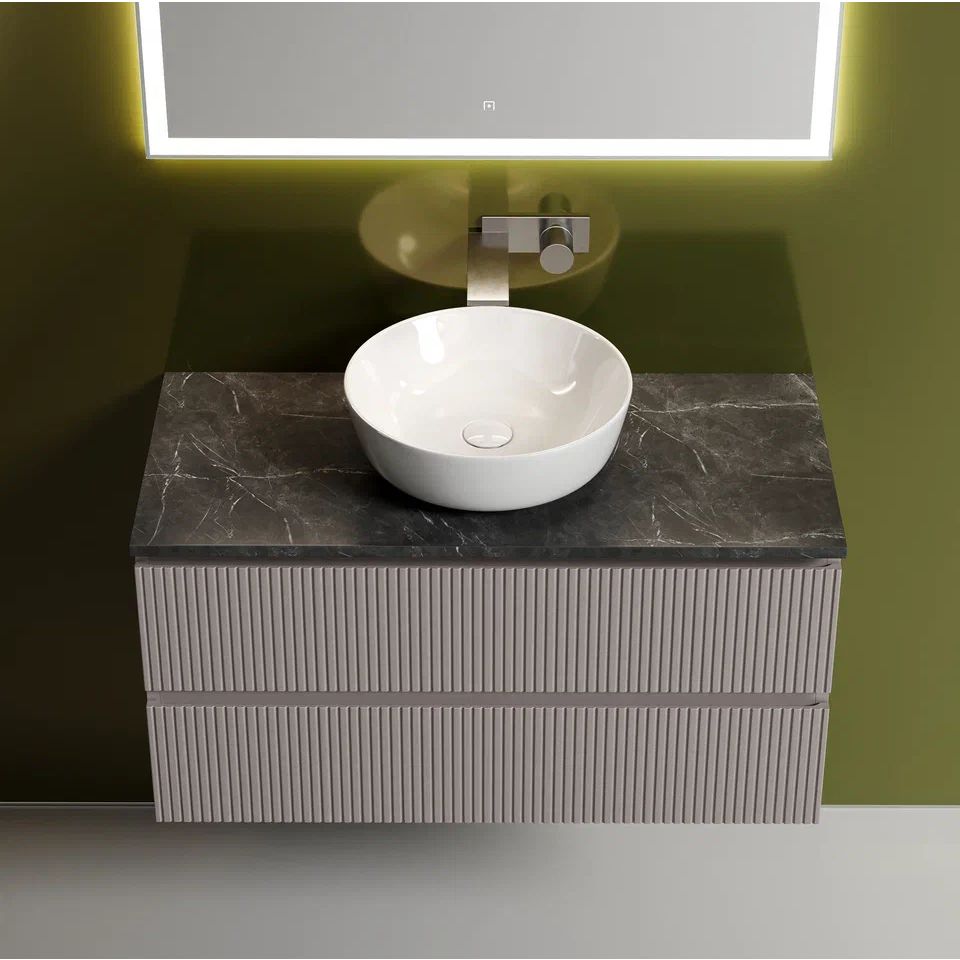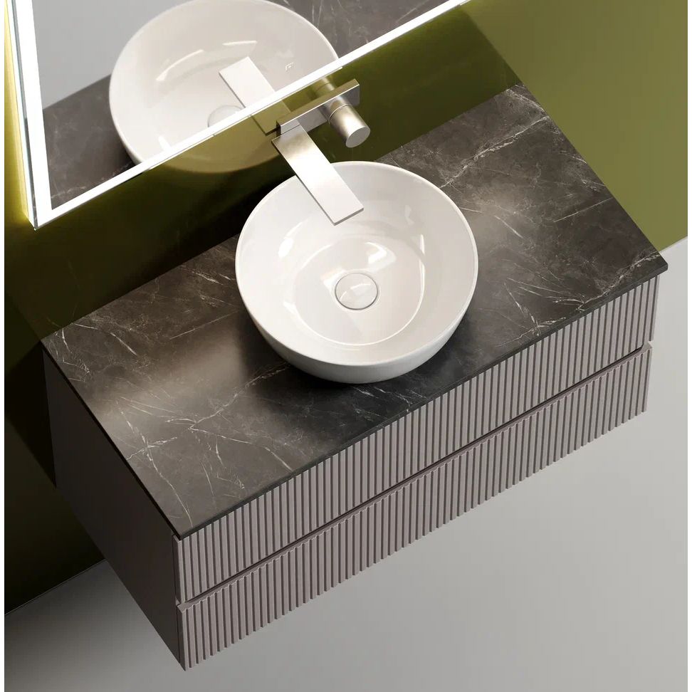 Тумба Sancos Snob T 100 из МДФ с пленочным покрытием имеет размеры 99,5x44,5x50 см и является подвесной конструкцией. Она оснащена механизмом доводчика, что обеспечивает плавное закрытие, а также имеет вместительные ящики. Раковина Ceramicanova Element CN6013 из фаянса, диаметром под сифон 3,2 см, поставляется без донного клапана. Основу комплекта составляют столешница из черного мрамора размером 100x46x2,1 см, изготовленная из керамогранита. Особенность столешницы – отсутствие готовых отверстий для смесителя.