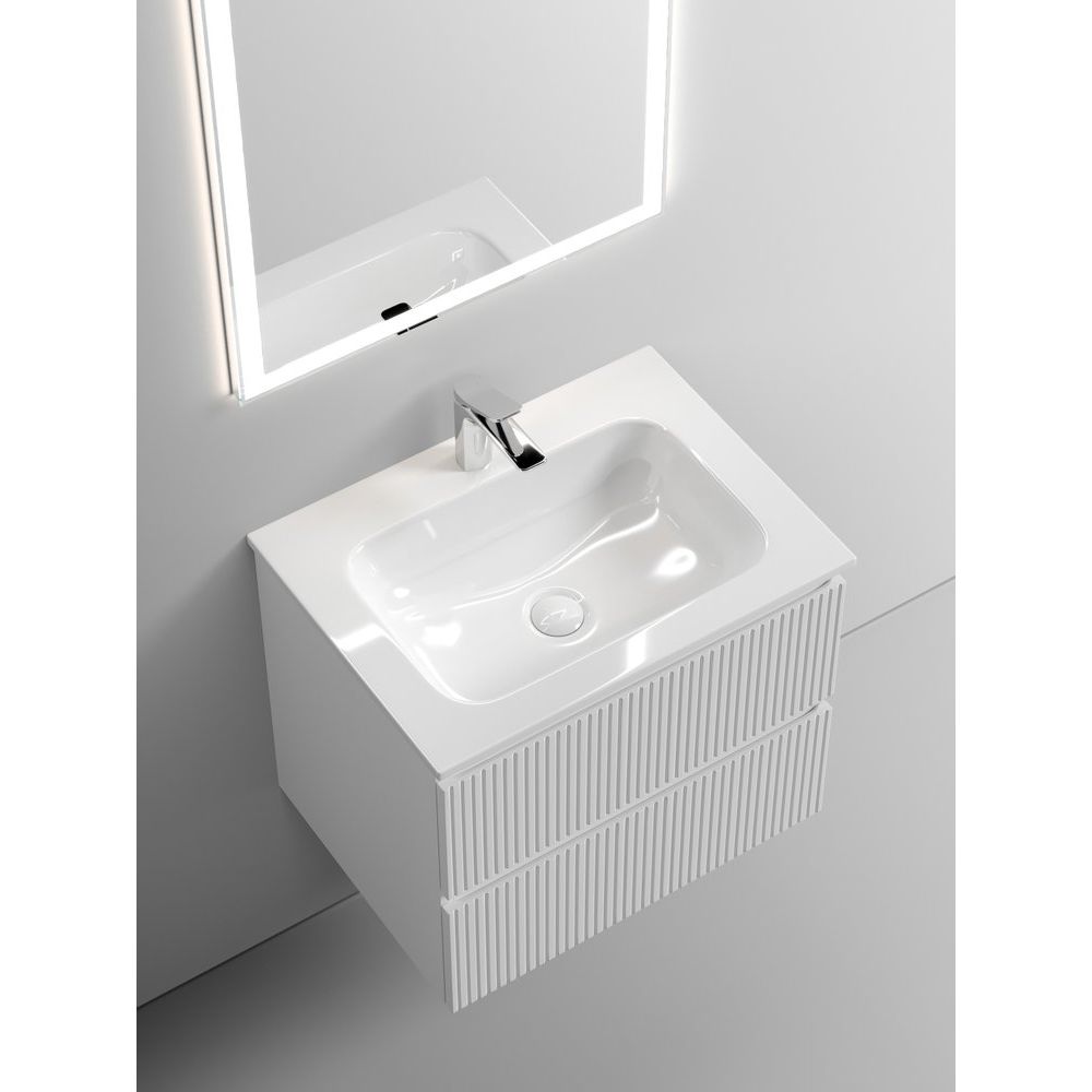 Тумба Sancos Snob T имеет размеры 59x44,5x50 см и подвесную конструкцию, что облегчает уборку и экономит пространство. Корпус и фасад выполнены из устойчивого к влаге МДФ, покрытого пленкой, обеспечивающей долговечность и защиту от внешних воздействий. Выдвижные ящики оснащены механизмом доводчика для мягкого и бесшумного открывания.