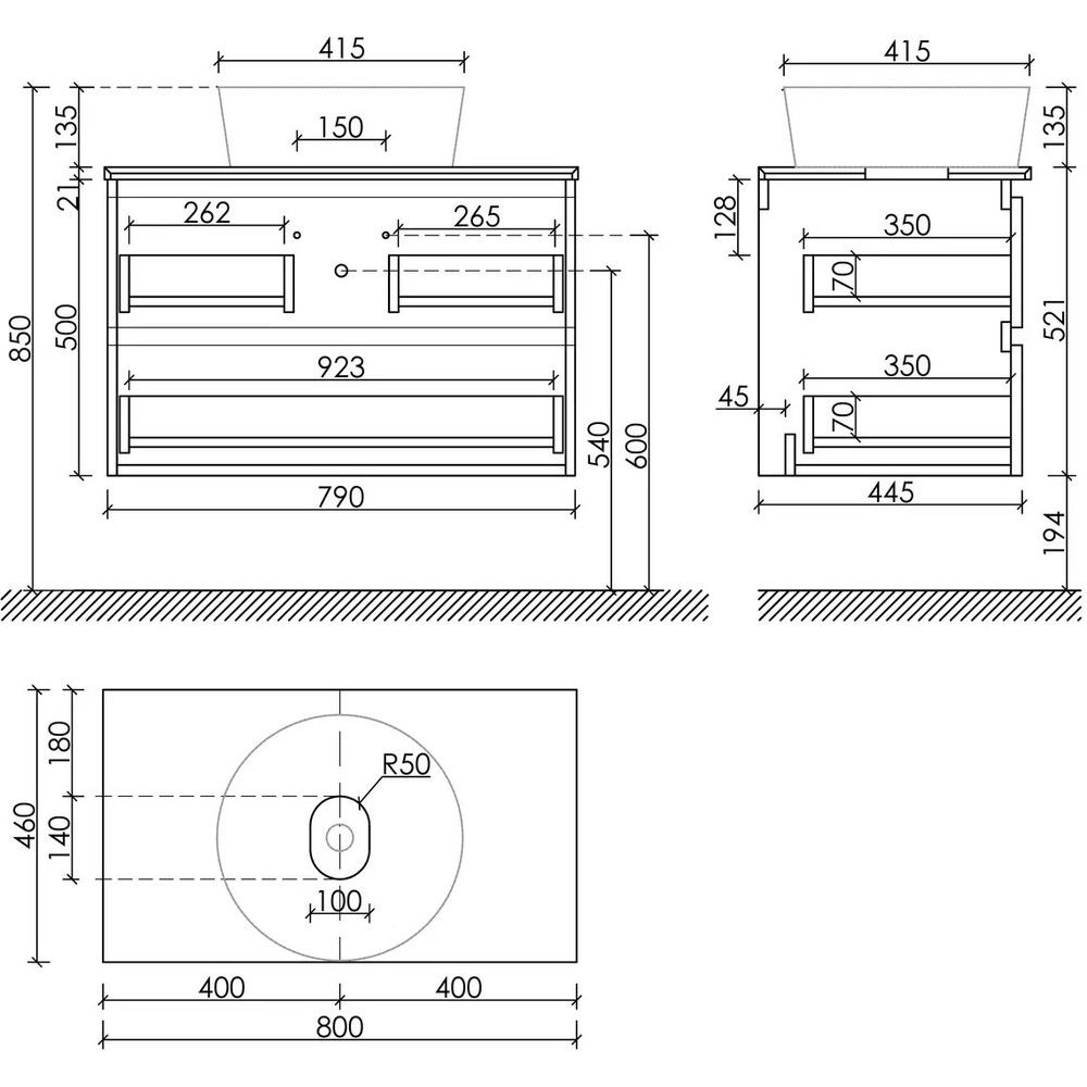 Тумба из коллекции Sancos Snob T обладает размерами 79x44,5x50 см и выполнена из МДФ с пленочным покрытием. Подвесная конструкция и механизм доводчика обеспечат комфорт и модернизируют вашу ванную комнату. Раковина Ceramicanova Element CN6013, выполненная из фаянса, имеет размеры 41,5x41,5 см и монтируется под сифон диаметром 3.2 см. Бежевая столешница Sancos TT80A2 из керамогранита не имеет готовых отверстий под смеситель, что дает возможность индивидуального решения. Изделие произведено в России и имеет гарантию 2 года.