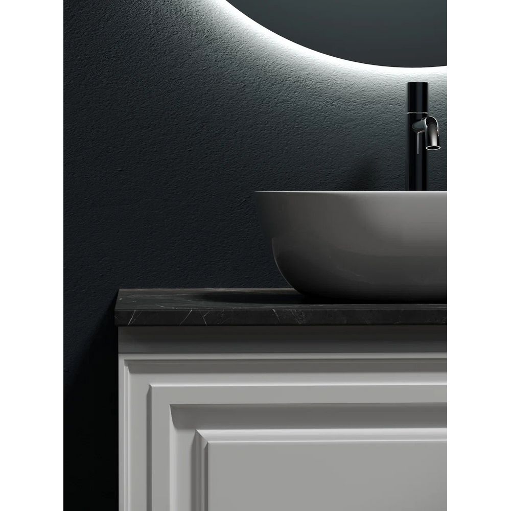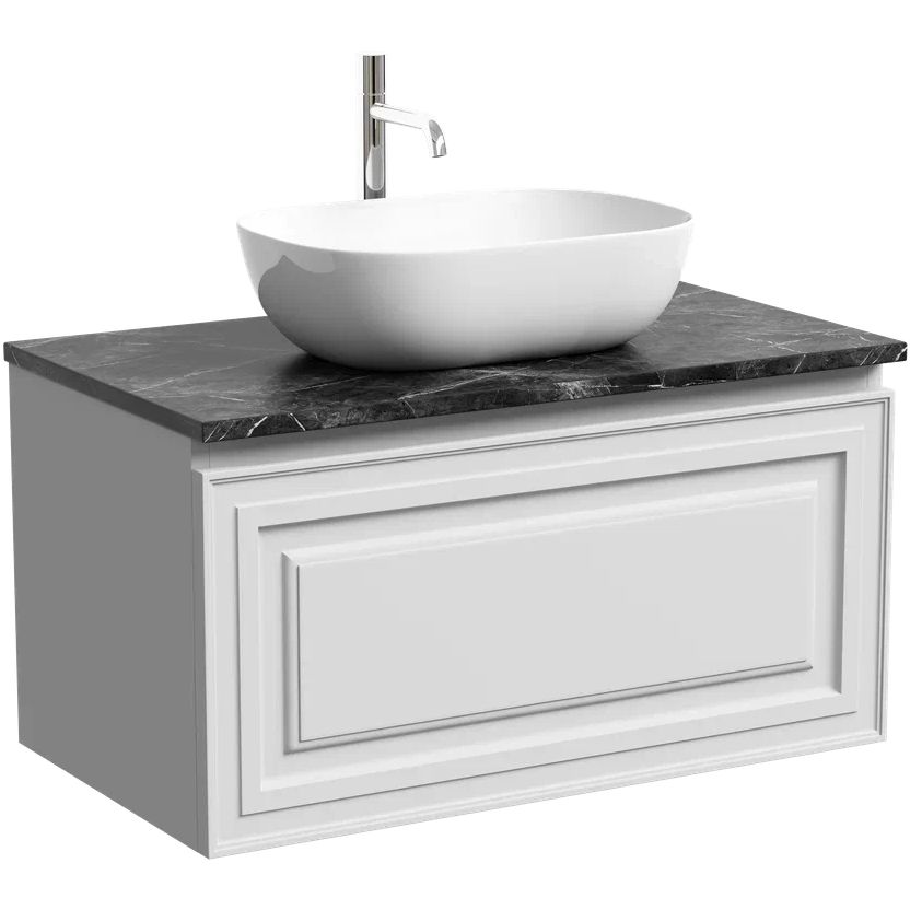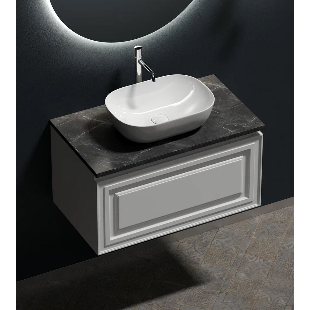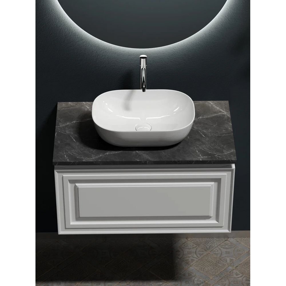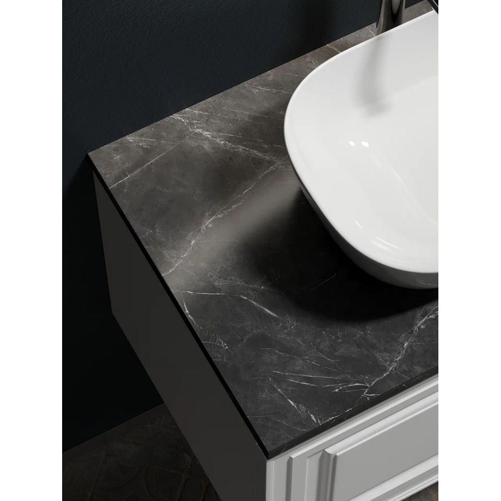 Столешница Sancos в черном мраморе, размером 80x46x2.1 см, выполнена из керамогранита, что обеспечивает ей прочность и элегантный вид. Она оснащена одним готовым отверстием для смесителя и поставляется без кронштейнов.