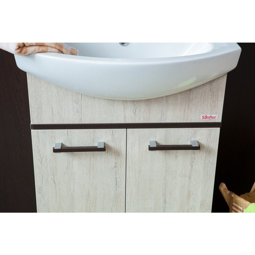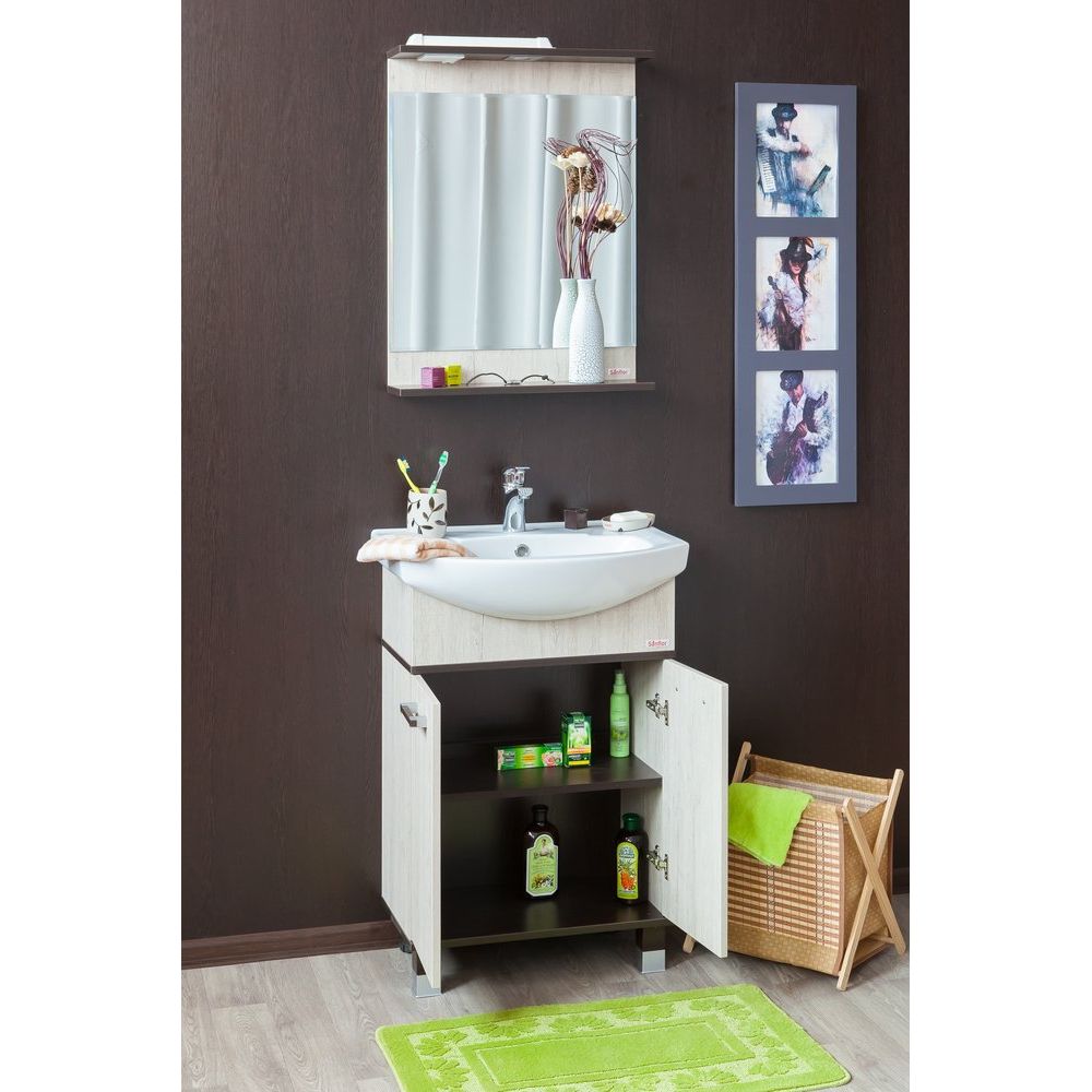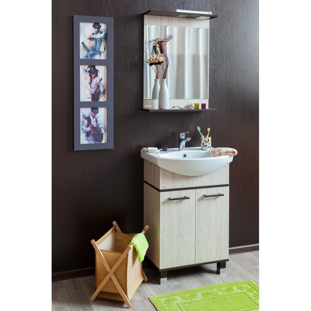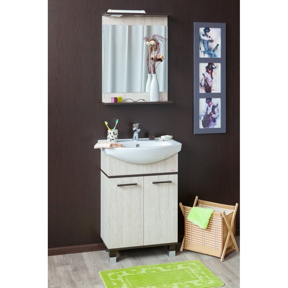 Мебельный комплект состоит из тумбы для комплекта Sanflor Толедо 60 в роскошном венге и орегоне. Габариты тумбы составляют 55,4x31,6x85 см, она специально сконструирована для крепления к стене с дополнительной опорой на ножки. Корпус и фасад тумбы изготовлены из ЛДСП с ламинатным покрытием, создавая тройную защиту от влаги. Располагая хромированной и венге фурнитурой, дверки оснащены механизмом доводчика, внутренние полки съемные, что позволяет легко настроить внутреннее пространство по своему усмотрению. Гарантия на изделие длится 2 года.